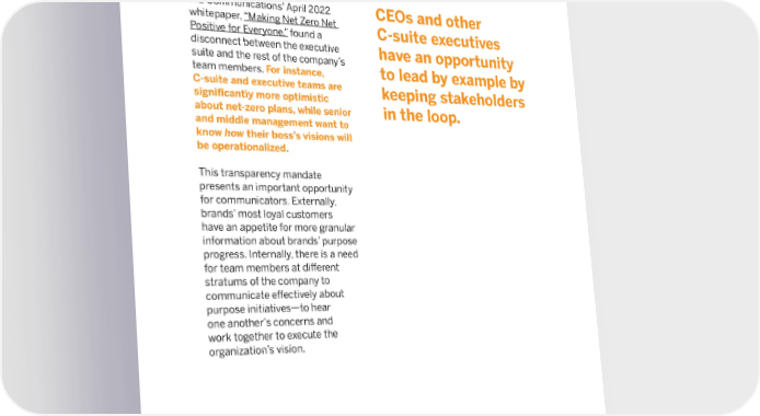 19 WE Communications’ April 2022 whitepaper, “Making Net Zero Net Positive for Everyone,” found a disconnect between the executive suite and the rest of the company’s team members. For instance, C-suite and executive teams are significantly more optimistic about net-zero plans, while senior and middle management want to know how their boss’s visions will be operationalized. This transparency mandate presents an important opportunity for communicators. Externally, brands’ most loyal customers have an appetite for more granular information about brands’ purpose progress. Internally, there is a need for team members at different stratums of the company to communicate effectively about purpose initiatives—to hear one another’s concerns and work together to execute the organization’s vision. CEOs and other C-suite executives have an opportunity to lead by example by keeping stakeholders in the loop. 19