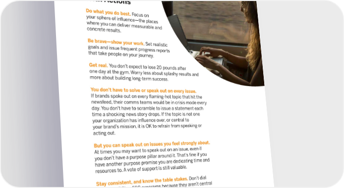 23 Matching Ambition With Actions Do what you do best. Focus on your sphere of influence—the places where you can deliver measurable and concrete results. Be brave—show your work . Set realistic goals and issue frequent progress reports that take people on your journey. Get real. You don’t expect to lose 20 pounds after one day at the gym. Worry less about splashy results and more about building long-term success. You don’t have to solve or speak out on every issue. If brands spoke out on every flaming-hot topic that hit the newsfeed, their comms teams would be in crisis mode every day. You don’t have to scramble to issue a statement each time a shocking news story drops. If the topic is not one your organization has influence over, or central to your brand’s mission, it is OK to refrain from speaking or acting out. But you can speak out on issues you feel strongly about. At times you may want to speak out on an issue, even if you don’t have a purpose pillar around it. That’s fine if you have another purpose promise you are dedicating time and resources to. A vote of support is still valuable. Stay consistent, and know the table stakes. Don’t dial back your DEI or ESG programs because they aren’t central to your purpose pillar. These are now as essential as profit- and-loss statements.