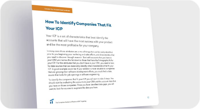 Evaluate Your Account-Based Landscape How To Identify Companies That Fit Your ICP Your ICP is a set of characteristics that best identify the accounts that will have the most success with your product and be the most profitable for your company. In many cases those attributes are a mix of things that can be easily identified prior to you beginning your marketing and sales efforts, and characteristics that you need to discover through research. Start with accounts that you have in your CRM and narrow the list down to those that have the firmographic fit for your ICP. For the attributes that you don’t have in your CRM, you need to look for data sources that can reasonably identify other characteristics that fit your ICP. A good example would be: if your solution is most valuable to companies that are growing their software development efforts, you could find a data source that looks for job openings in software engineering. To identify the companies that fit your ICP you will want to take 3 steps. You should start by evaluating the accounts in your CRM and the account data that you have on those companies. Once you have identified data gaps, you will want to look for sources to augment the data you have. The Complete Guide to Effective ABM Targeting 12