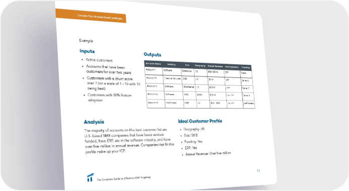 Evaluate Your Account-Based Landscape Example Inputs Outputs • Active customers Account Name Industry Size Geography Annual Revenue Technographics Founding • Accounts that have been Account 1 Software Enterprise US $50-100 M ERP Public customers for over two years • Customers with a churn score Account 2 Financial Services SMB US $5 M ERP Series A over 7 (on a scale of 1 - 10 with 10 Account 3 Software Mid-Market US $15 M ERP Series C being best) • Customers with 80% feature Account 4 Software SMB APAC $10 M No ERP Series A adoption Account 5 Healthcare SMB US $50 - 100T No ERP Self-funded Analysis Ideal Customer Profile The majority of accounts on this best customer list are • Geography: US U.S.-based SMB companies that have been venture • Size: SMB funded, have ERP, are in the software industry, and have • Funding: Yes over five million in annual revenue. Companies that fit this profile make up your ICP. • ERP: Yes • Annual Revenue: Over five million The Complete Guide to Effective ABM Targeting 11