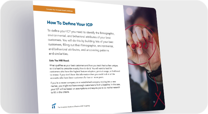 Evaluate Your Account-Based Landscape How To Define Your ICP To define your ICP you need to identify the firmographic, environmental, and behavioral attributes of your best customers. You will do this by building lists of your best customers, filling out their firmographic, environmental, and behavioral attributes, and uncovering patterns and similarities. Lists You Will Need: What qualifies as your best customers and how you track that is often unique, so it is hard to prescribe exactly how to do it. You will want to look for customers who have the highest feature adoption, product usage, or likelihood to renew. If you don’t have this information then you could look at all the accounts who have been customers for two or more years. If you’re a newer company or an established company moving into a new market, you might not have enough customers to form a baseline. In this case, your ICP will be based on assumptions and require you to do market research to fill in the criteria. The Complete Guide to Effective ABM Targeting 10 10