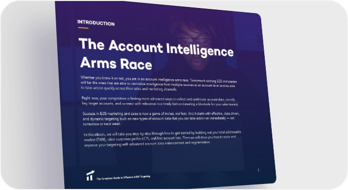 INTRODUCTION The Account Intelligence Arms Race Whether you know it or not, you are in an account intelligence arms race. Tomorrow’s winning B2B companies will be the ones that are able to centralize intelligence from multiple sources at an account level and be able to take action quickly across their sales and marketing channels. Right now, your competition is finding more advanced ways to collect and synthesize account data, identify key target accounts, and connect with relevance in a timely fashion (creating a blockade for your sales teams). Success in B2B marketing and sales is now a game of inches, not feet. And it starts with effective, data-driven, and dynamic targeting built on new types of account data that you can take action on immediately –– not tomorrow or next week. In this eBook, we will take you step-by-step through how to get started by building out your total addressable market (TAM), ideal customer profile (ICP), and first account lists. Then we will show you how to scale and improve your targeting with advanced account data enhancement and segmentation. The Complete Guide to EfThe Complete Guide to Effective ABM Tfective ABM Tarargetinggeting 3 3