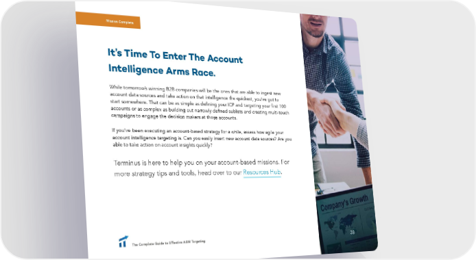 Mission Complete It’s Time To Enter The Account Intelligence Arms Race. While tomorrow’s winning B2B companies will be the ones that are able to ingest new account data sources and take action on that intelligence the quickest, you’ve got to start somewhere. That can be as simple as defining your ICP and targeting your first 100 accounts or as complex as building out narrowly defined sublists and creating multi-touch campaigns to engage the decision makers at those accounts. If you’ve been executing an account-based strategy for a while, assess how agile your account intelligence targeting is. Can you easily insert new account data sources? Are you able to take action on account insights quickly? Terminus is here to help you on your account-based missions. For more strategy tips and tools, head over to our Resources Hub. The Complete Guide to Effective ABM Targeting 38 38