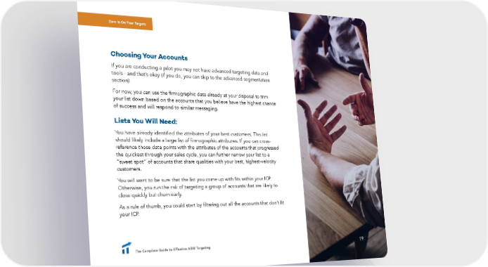 Zero In On Your Targets Choosing Your Accounts If you are conducting a pilot you may not have advanced targeting data and tools - and that’s okay (if you do, you can skip to the advanced segmentation section). For now, you can use the firmographic data already at your disposal to trim your list down based on the accounts that you believe have the highest chance of success and will respond to similar messaging. Lists You Will Need: You have already identified the attributes of your best customers. This list should likely include a large list of firmographic attributes. If you can cross- reference those data points with the attributes of the accounts that progressed the quickest through your sales cycle, you can further narrow your list to a “sweet spot” of accounts that share qualities with your best, highest-velocity customers. You will want to be sure that the list you come up with fits within your ICP. Otherwise, you run the risk of targeting a group of accounts that are likely to close quickly but churn early. As a rule of thumb, you could start by filtering out all the accounts that don’t fit your ICP. The Complete Guide to Effective ABM Targeting 19 19