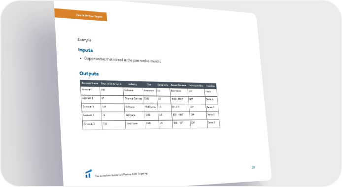 Zero In On Your Targets Example Inputs • Opportunities that closed in the past twelve months Outputs Account Name Days in Sales Cycle Industry Size Geography Annual Revenue Technographics Founding Account 1 238 Software Enterprise US $50-100 M ERP Public Account 2 67 Financial Services SMB US $100 - 500 T ERP Series A Account 3 149 Software Mid-Market US $1 -5 M ERP Series C Account 4 76 Software SMB US $50 - 100 T ERP Series A Account 5 156 Healthcare SMB US $50 - 100T ERP Series B The Complete Guide to Effective ABM Targeting 20