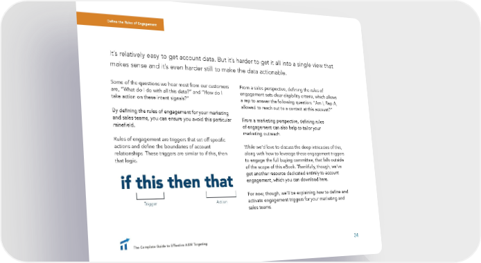 Define the Rules of Engagement It’s relatively easy to get account data. But it’s harder to get it all into a single view that makes sense and it’s even harder still to make the data actionable. Some of the questions we hear most from our customers From a sales perspective, defining the rules of are, “What do I do with all this data?” and “How do I engagement sets clear eligibility criteria, which allows take action on these intent signals?” a rep to answer the following question: “Am I, Rep A, allowed to reach out to a contact at this account?” By defining the rules of engagement for your marketing and sales teams, you can ensure you avoid this particular From a marketing perspective, defining rules minefield. of engagement can also help to tailor your marketing outreach. Rules of engagement are triggers that set off specific actions and define the boundaries of account While we’d love to discuss the deep intricacies of this, relationships. These triggers are similar to if this, then along with how to leverage these engagement triggers that logic. to engage the full buying committee, that falls outside of the scope of this eBook. Thankfully, though, we’ve got another resource dedicated entirely to account engagement, which you can download here. For now, though, we’ll be explaining how to define and Trigger Action activate engagement triggers for your marketing and sales teams. The Complete Guide to Effective ABM Targeting 34