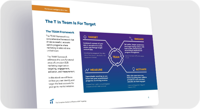 The Account Intelligence Arms Race The T In Team Is For Target The TEAM Framework The TEAM framework is a TARGET ENGAGE comprehensive framework that drives successful, account- Combine & connect all your Get earlier, deeper penetration centric programs where data in one place to easily into target buying centers with marketing & sales act as a create and manage target best-in-class account-based account lists advertising & multi-channel unified team. program management Marketing/Sales Alignment | Reporting Clarity | New Account Identification (via TEAM Display & LinkedIn | Offline Campaigns The TEAM framework engagement & intent) | Email addresses the core functional areas of a modern B2B marketing organization: targeting, engagement, MEASURE ACTIVATE activation, and measurement. In this ebook we will focus Super-simple reporting so you Help sales open more ops, on how you can identify and know how your account-based faster, by giving them realtime programs are driving revenue prompts to reach out when target the best accounts for accounts are most engaged your go-to-market initiative. Account Graph Lead-to-Account Mapping | Account-Level ROI | ABM Scorecard Customized Engagement Triggers | Native to SFDC The Complete Guide to Effective ABM Targeting 4
