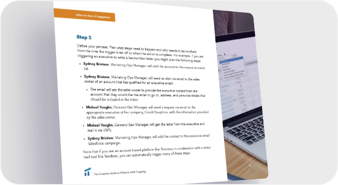 Define the Rules of Engagement Step 3 Define your process. Plan what steps need to happen and who needs to be involved from the time the trigger is set off to when the action is complete. For example, if you are triggering an executive to write a handwritten letter you might plan the following steps: • Sydney Bristow, Marketing Ops Manager, will add the account to the executive email list. • Sydney Bristow, Marketing Ops Manager, will send an alert via email to the sales owner of an account that has qualified for an executive email. • The email will ask the sales owner to provide the executive contact from the account that they would like the letter to go to, address, and personal details that should be included in the letter. • Michael Vaughn, Demand Gen Manager, will send a request via email to the appropriate executive at her company, Credit Dauphine, with the information provided by the sales owner. • Michael Vaughn, Demand Gen Manager, will get the letter from the executive and mail it via USPS. • Sydney Bristow, Marketing Ops Manager, will add the contact to the executive email Salesforce campaign. Note that if you use an account-based platform like Terminus in combination with a direct mail tool like Sendoso, you can automatically trigger many of these steps. The Complete Guide to Effective ABM Targeting 36 36