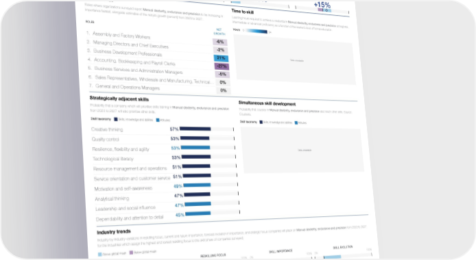 Skill Profile Reskilling Ranking Manual dexterity, endurance and precision 23rd Skills, knowledge and abilities Physical abilities Manual dexterity, endurance and precision Global Skills Taxonomy / / Five year trend Reskilling focus Skill importance Skill evolution Learning hours spent pursuing assessements and Companies for which Manual dexterity, Companies for which Manual dexterity, Share of companies for which Manual dexterity, credentials in Manual dexterity, endurance and endurance and precision is a priority in their endurance and precision is a core skill for workers endurance and precision is increasing or precision from 2017 to 2022 (share of total upskilling and reskilling programmes for 2023-2027 (share of companies surveyed) decreasing in importance at work. White diamond learning hours). Source: Coursera (share of companies surveyed) and label represent net share. 8% 16% +15% Data unavailable Jobs in focus Time to skill Roles where organizations surveyed report Manual dexterity, endurance and precision to be increasing in Learning hours required to achieve a credential in Manual dexterity, endurance and precision at beginner, importance fastest, alongside estimates of the net job growth (percent) from 2023 to 2027. intermediate or advanced proficiency as a function of the learner’s level of formal education. Hours 0 34 NET ROLES GROWTH -6% 1. Assembly and Factory Workers -2% 2. Managing Directors and Chief Executives Data unavailable 21% 3. Business Development Professionals -27% 4. Accounting, Bookkeeping and Payroll Clerks -5% 5. Business Services and Administration Managers 0% 6. Sales Representatives, Wholesale and Manufacturing, Technical … 0% 7. General and Operations Managers Strategically adjacent skills Simultaneous skill development Probability that a company which will prioritise skills training in Manual dexterity, endurance and precision Probability that courses in Manual dexterity, endurance and precision also teach other skills. Source: from 2023 to 2027 will also prioritise other skills. Coursera. Skill taxonomy Skills, knowledge and abilities Attitudes Skill taxonomy Skills, knowledge and abilities Attitudes 57% Creative thinking 53% Quality control 53% Resilience, flexibility and agility Data unavailable 53% Technological literacy 51% Resource management and operations 51% Service orientation and customer service 49% Motivation and self-awareness 47% Analytical thinking 47% Leadership and social influence 45% Dependability and attention to detail Industry trends Industry-by-industry variations in reskilling focus, current and future importance, forecast evolution in importance, and strategic focus companies will place on Manual dexterity, endurance and precision from 2023 to 2027 for the industries which assign the highest and lowest reskilling focus to this skill (share of companies surveyed) Above global mean Below global mean RESKILLING FOCUS SKILL IMPORTANCE SKILL EVOLUTION INDUSTRY 0% 100% 0% 100% 0% 100% Mining and Metals Agriculture, forestry, and fishing Advanced manufacturing Electronics Telecommunications Information and technology services