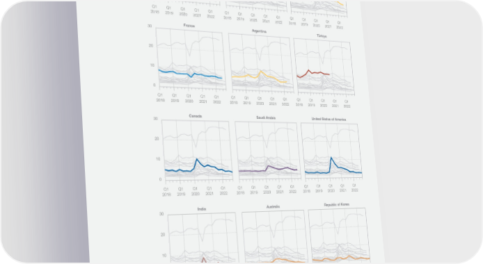 FIGURE 1.1 Unemployment rate across G20 countries Quarterly unemployment rate, 2018Q1–2022Q4 30 South Africa Italy Brazil 20 10 Unemployment rate (%) 0 Q1 Q1 Q1 Q1 Q1 Q1 Q1 Q1 Q1 Q1 Q1 Q1 Q1 Q1 Q1 2018 2019 2020 2021 2022 2018 2019 2020 2021 2022 2018 2019 2020 2021 2022 30 France Argentina Türkiye 20 10 0 Q1 Q1 Q1 Q1 Q1 Q1 Q1 Q1 Q1 Q1 Q1 Q1 Q1 Q1 Q1 2018 2019 2020 2021 2022 2018 2019 2020 2021 2022 2018 2019 2020 2021 2022 30 Canada Saudi Arabia United States of America 20 10 0 Q1 Q1 Q1 Q1 Q1 Q1 Q1 Q1 Q1 Q1 Q1 Q1 Q1 Q1 Q1 2018 2019 2020 2021 2022 2018 2019 2020 2021 2022 2018 2019 2020 2021 2022 30 India Australia Republic of Korea 20 10 0 Q1 Q1 Q1 Q1 Q1 Q1 Q1 Q1 Q1 Q1 Q1 Q1 Q1 Q1 Q1 2018 2019 2020 2021 2022 2018 2019 2020 2021 2022 2018 2019 2020 2021 2022 Central Asia East Asia and the Pacific Europe Latin America and the Caribbean Middle East and North Africa North America South Asia Sub-Saharan Africa Future of Jobs Report 2023 9