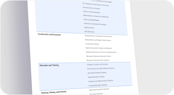 TABLE A3 Job taxonomy The occupational taxonomy was modiļ¬ed and extended from O*NET SOC. Job family Occupation Computer and Mathematical Database Architects Devops Engineers FinTech Engineers Full Stack Engineers Geospatial Information Scientists and Technologists ICT Operations and User Support Technicians Information Security Analysts Internet of Things Specialists Mathematicians, Actuaries and Statisticians Online Learning Managers Software and Applications Developers Software testers Web Developers Construction and Extraction Building Finishers and Related Trades Workers Building Frame and Related Trades Workers Construction Laborers Electrical Equipment Installers and Repairers Explosives Workers and Ordnance Handling Experts Mining and Petroleum Extraction Workers Mining and Petroleum Plant Operators Education and Training Librarians, Curators, and Archivists Primary School and Early Childhood Teachers Secondary Education Teachers Special Education Teachers University and Higher Education Teachers Vocational Education Teachers Farming, Fishing, and Forestry Agricultural Equipment Operators Agricultural Inspectors Animal Breeders Farmworkers and Laborers Fishers and Related Fishing Workers Forest and Conservation Workers Graders and Sorters, Agricultural Products Hunters and Trappers Future of Jobs Report 2023 70