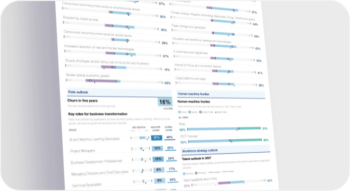 Industry Profile Global Employee (millions, ILO estimates) 1 / 2 Advanced manufacturing 29.9 Trend outlook Global trends and their impact on job creation Technologies and their impact on job creation Trends most most likely to drive industry transformation and their expected impact job creation, ordered by net Technologies most most likely to drive industry transformation and their expected impact job creation, ordered effect (share of organizations surveyed) by net effect (share of organizations surveyed) Job creator Job displacer Net effect Global net effect Job creator Job displacer Net effect Global net effect Investments to facilitate the green transition of your business Environmental management technologies (e.g. pollution abatement, recycling) -100% +100% -100% +100% 62% 70% Broader application of Environmental, Social and Governance (ESG) standards Big-data analytics -100% +100% -100% +100% 57% 57% Consumers becoming more vocal on environmental issues Climate-change mitigation technology (Alternative Energy, Greenhouse gases … -100% +100% -100% +100% 35% 54% Broadening digital access Power storage and generation -100% +100% -100% +100% 30% 50% Consumers becoming more vocal on social issues Education and workforce development technologies -100% +100% -100% +100% 29% 45% Increased adoption of new and frontier technologies E-commerce and digital trade -100% +100% -100% +100% 27% 32% Supply shortages and/or rising cost of inputs for your business Internet of things and connected devices -100% +100% -100% +100% -6% 31% Slower global economic growth Digital platforms and apps -100% +100% -100% +100% -53% 28% Role outlook Human-machine frontier Churn in five years Human-machine frontier 16% Five-year structural labour-force churn (percent) Tasks performed by humans and machines today and in 2027 (share of total) Global 23% Human Machine Industry Frontier Global Frontier Key roles for business transformation ALL TASKS Roles most selected by organizations surveyed (as either growing, stable or declining), ordered by net role growth, and their net growth and structural churn (percent) Now NET GROWTH INDUSTRY GLOBAL ROLES -50% 0 50% CHURN CHURN 69% 31% 2027 Forecast 30% 40% AI and Machine Learning Specialists 55% 45% 10% 25% Project Managers Workforce strategy outlook 15% 24% Business Development Professionals Talent outlook in 2027 Expected change in talent availability, development and retention in the next five years (share of organizations surveyed) 8% 17% Managing Directors and Chief Executives Improving Worsening Global average Global average 8% 24% Technical Specialists Talent availability when hiring -100% +100% 31% 40% 7% 15% Industrial and Production Engineers Talent development of existing workforce -100% +100% 6% 83% 10% 14% General and Operations Managers Talent retention of existing workforce 8% 19% Mechanics and Machinery Repairers -100% +100% 27% 48% Sales Representatives, Wholesale and 19% 14% … Manufacturing, Technical and Scientific 15% 17% Assembly and Factory Workers 18% 35% Administrative and Executive Secretaries 39% 42% Data Entry Clerks