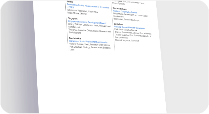 Netherlands Thailand Amsterdam Centre for Business Innovation, Chulalongkorn Business School University of Amsterdam Kanyarat (Lek) Sanoran, Assistant Professor and Henk W. Volberda, Director and Professor of Assistant Dean at Dean’s Office Strategy & Innovation Wilert Puriwat, Professor and Dean Kevin Heij, Project Manager Nat Kulvanich, Assistant Professor Pieter van den Brink, Research Assistant Türkiye Pakistan TÜSIAD, Sabanci University Competitivness Mishal Pakistan Forum - REF Amir Jahangir, Chief Executive Officer Esra Durceylan Kaygusuz, Competitiveness Forum Puruesh Chaudhary, Director Director Amna Sabahat Bhutta, Director Sezen Uğurlu Sum, Competitiveness Forum Project Specialist Serbia Foundation for the Advancement of Economics Western Balkans - FREN Regional Cooperation Council Aleksandar Radivojević, Coordinator Sinisa Marcic, Senior Expert on Human Capital Dejan Molnar, Director Development Bojana Zorić, Senior Policy Analyst Singapore Singapore Economic Development Board Zimbabwe Cheng Wai San, Director and Head, Research and National Competitiveness Commission Statistics Unit Phillip Phiri, Executive Director Teo Xinyu, Executive Officer, Senior, Research and Brighton Shayanewako, Director, Competitiveness Statistics Unit Douglas Muzimba, Chief Economist, International Competitiveness South Africa Elizabeth Magwaza, Economist Harambee Youth Employment Accelerator Victoria Duncan, Head, Research and Evidence Rob Urquhart, Strategy, Research and Evidence Lead Future of Jobs Report 2023 290