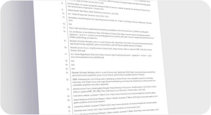 Endnotes 1. OECD, Unemployment Rates Update: June 2022. 2. OECD, Jobs Outlook 2022, 2022. 3. Gourinchas, Fiscal Policy in the age of COVID: Does it “Get in all the cracks”, 2021. 4. Ibid. 5. OECD, Jobs Outlook 2022, 2022. 6. US Chamber of Commerce, Understanding America’s Labor Shortage: The Most Impacted Industries, September 2022 7. PWC,Gloal Workforce Survey, Hopes and fears 2022, (https://www.pwc.com/gx/en/hopes-and-fears/downloads/global- workforce-hopes-and-fears-survey-2022-v2.pdf) 8. ILO Policy Brief, An uneven and gender-unequal COVID-19 recovery: Update on gender and employment trends 2021, International Labour Organization, October 2021. 9. Global Gender Gap Report 2022, World Economic Forum, July 2022. 10. ILO, Global Employment Trends for Youth 2022, 2022. 11. World Bank, Social Protection and Jobs Responses to COVID-19 : A Real-Time Review of Country Measures, February 2022. 12. Ibid. 13. https://read.oecd-ilibrary.org/development/tackling-vulnerability-in-the-informal-economy_939b7bcd-en#page18. 14. ILO, ILO Monitor on the World from Work 10th Edition, October 2022 (https://www.ilo.org/wcmsp5/groups/public/--- dgreports/---dcomm/---publ/documents/briefingnote/wcms_859255.pdf) https://www.ilo.org/global/publications/books/ WCMS_859255/lang--en/index.htm. 15. Elizabeth Schnabel, Monetary policy in a cost-of-living crisis, September 2022 (https://www.ecb.europa.eu/press/key/ date/2022/html/ecb.sp220930_annex~b1ca1312f6.en.pdf?12576bc04ca2ef94c2d044e731f5a9ad). 16. World Economic Forum, Chief Economist Outlook 2022, (https://www3.weforum.org/docs/WEF_Chief_Economists_ Outlook_2022.pdf). 17. ILO, Global Wage Report 2022-2023 (https://www.ilo.org/wcmsp5/groups/public/---dgreports/---dcomm/---publ/ documents/publication/wcms_862569.pdf). 18. Ibid. 19. Ibid. 20. Ibid. 21. Elizabeth Schnabel, Monetary policy in a cost-of-living crisis, September 2022 (https://www.ecb.europa.eu/press/key/ date/2022/html/ecb.sp220930_annex~b1ca1312f6.en.pdf?12576bc04ca2ef94c2d044e731f5a9ad). 22. UNDP, Addressing the cost-of-living crisis in developing countries, Poverty and vulnerability projections and policy responses, 2022 (https://www.undp.org/publications/addressing-cost-living-crisis-developing-countries-poverty-and- vulnerability-projections-and-policy-responses). 23. World Economic Forum, Building Back Broader: Policy Pathways for Economic Transformations, 2022 (https://www3. weforum.org/docs/WEF_GFC_NES_Policy_Pathways_for_an_Economic_Transformation_2021.pdf). 24. CultureAmp website, accessed 17 March 2023, https://www.cultureamp.com/science/insights/all-industries-global. 25. Global Workforce of the Future Research, Adecco website, accessed 17 March 2023 https://www.adeccogroup.com/ global-workforce-of-the-future-research/. 26. CultureAmp website, accessed 17 March 2023, https://www.cultureamp.com/science/insights/all-industries-global. 27. Randstad work monitor 2023, https://workforceinsights.randstad.com/workmonitor-2023. 28. Global Workforce of the Future Research, Adecco website, accessed 17 March 2023 https://www.adeccogroup.com/ global-workforce-of-the-future-research/. 29. Randstad work monitor 2023, https://workforceinsights.randstad.com/workmonitor-2023. 30. Randstad work monitor 2023, https://workforceinsights.randstad.com/workmonitor-2023. 31. ManpowerGroup, The New Human Age: 2023 Workforce Trends https://workforce-resources.manpowergroup.com/ home/the-new-human-age. 32. ManpowerGroup, The New Human Age: 2023 Workforce Trends https://workforce-resources.manpowergroup.com/ home/the-new-human-age. 33. https://arxiv.org/pdf/2303.10130.pdf. 34. IMF, World Economic Outlook: Countering the Cost of Living Crisis, 2022. 35. IMF, “World Economic Outlook”, 2023. Future of Jobs Report 2023 294
