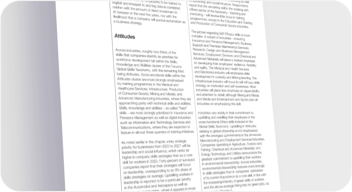 with 65% in agreement that they will stimulate and Transportation and Advanced Manufacturing labour-market growth and just 7% predicting industries. contraction (see Chapter 2). Specialized roles in AI and big data are estimated to grow by 30-35% Figure 4.8 shows broader trends in skills strategies (see Chapter 3). Big-data analytics is the third- across the full spectrum of Attitudes covered by most likely technology for companies to adopt by the Global Skills Taxonomy. Across industries, only 2027, with 80% of companies planning to integrate Care, Personal Service and Wellbeing; Education it more deeply into their operations, and 75% of and Training; and Medical and Healthcare Services companies planning to integrate AI techniques such prioritize working with others over the Self-Efficacy as machine learning and neural networks. skills emphasized elsewhere. These industries are among many to report placing a pronounced As Figure 4.7 demonstrates, there is widespread emphasis on empathy and active listening as well increase in prioritizing AI strategies across sectors. as leadership and social influence. Respondents However, the need for employees to be trained to report that the remaining skill in the working with exploit and interpret AI and big data is correlated others sector of the taxonomy – teaching and neither with the amount of direct investment in mentoring – will receive little focus in training AI foreseen in the next five years, nor with the programmes, except in the Education and Training likelihood that a company will pursue automation as and Production of Consumer Goods industries. a business strategy. The picture regarding Self-Efficacy skills is more complex. A subset of industries – including Attitudes Insurance and Pensions Management; Business Support and Premises Maintenance Services; Research, Design and Business Management Across industries, roughly two-thirds of the Services; Employment Services; and Chemical and skills that companies identify as priorities for Advanced Materials will place a marked emphasis workforce development fall within the Skills, on developing their employees’ resilience, flexibility Knowledge and Abilities cluster of the Forum’s and agility. The Medical and Health Services Global Skills Taxonomy, with the remaining third and Electronics industry will emphasize skills being Attitudes. Socio-emotional skills within the development in curiosity and lifelong learning. The Attitudes cluster are most strongly emphasized Infrastructure industry will focus its self-efficacy skills by training programmes in the Medical and strategy on motivation and self-awareness. Most Healthcare Services; Infrastructure; Production industries will place less emphasis on dependability of Consumer Goods; Mining and Metals; and and attention to detail; although Mining and Metals Advanced Manufacturing industries, where they are and Media and Entertainment and Sports lead all approaching parity with technical skills and abilities. industries on emphasizing this skill. Skills, knowledge and abilities – so called “hard” skills – are most strongly prioritized in Insurance and Industries vary widely in their commitment to Pensions Management as well as digital industries upskilling and reskilling their employees in the such as Information and Technology Services and cross-functional Ethics skills included in the Telecommunications, where they are expected to Global Skills Taxonomy. Upskilling in Attitudes feature in almost three-quarters of training initiatives. relating to global citizenship is not emphasized, with the strongest commitments in the Advanced As noted earlier in the chapter, a key strategic Manufacturing and Employment Services industries. priority for businesses from 2023 to 2027 will be Companies operating in Agriculture, Forestry and leadership and social influence, which ranks far Fishing; Chemical and Advanced Materials; and higher in company skills strategies than as a core Energy Technology and Utilities demonstrate the skill for workers in 2023. Forty percent of surveyed greatest commitment to upskilling their workers companies report that their strategies will focus in environmental stewardship. Across industries, on leadership, corresponding to an 8% share of environmental stewardship features more strongly skills strategies on average. Upskilling workers in in skills strategies than in companies’ estimation leadership is reported to be a particular priority of its current importance as a core skill, in line with in the Automotive and Aerospace as well as the increasing intensity of green skills of workers Infrastructure industries, where it appears in more and the above-average hiring rate for green jobs, as than 60% of five-year strategies, and is also the reported in Chapter 3. top priority across all skills in both the Supply Chain Future of Jobs Report 2023 47