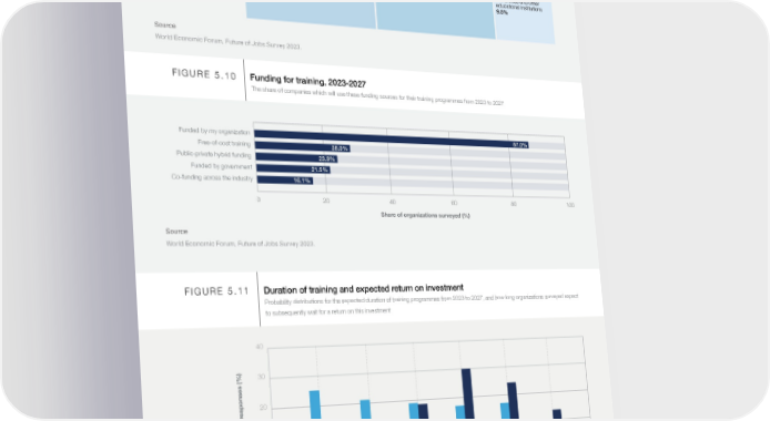 FIGURE 5.9 Training provision, 2023-2027 The expected mean composition of training programmes Employer-sponsored apprenticeships Licensed training from professional associations Private-sector 15.4% 12.5% online-learning platforms 11.5% On-the-job training and coaching Internal training departments 26.7% 23.5% Universities and other educational institutions 9.5% Source World Economic Forum, Future of Jobs Survey 2023. FIGURE 5.10 Funding for training, 2023-2027 The share of companies which will use these funding sources for their training programmes from 2023 to 2027 Funded by my organization 87.0% Free-of-cost training 28.0% Public-private hybrid funding 23.9% Funded by government 21.5% Co-funding across the industry 16.1% 0 20 40 60 80 100 Share of organizations surveyed (%) Source World Economic Forum, Future of Jobs Survey 2023. FIGURE 5.11 Duration of training and expected return on investment Probability distributions for the expected duration of training programmes from 2023 to 2027, and how long organizations surveyed expect to subsequently wait for a return on this investment 40 30 esponses (%)20 e of r 10 Shar 0 Within Within Within Within More than Difficult 1 month 1 to 3 months 3 to 6 months 6 to 12 months 1 year to assess Expected duration Expected ROI Source World Economic Forum, Future of Jobs Survey 2023. Future of Jobs Report 2023 58