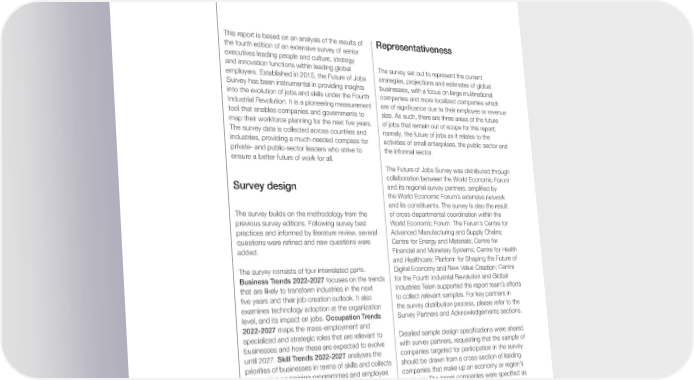 May 2023 Future of Jobs Report 2023 Appendix A Analysis methodology This report is based on an analysis of the results of Representativeness the fourth edition of an extensive survey of senior executives leading people and culture, strategy and innovation functions within leading global The survey set out to represent the current employers. Established in 2015, the Future of Jobs strategies, projections and estimates of global Survey has been instrumental in providing insights businesses, with a focus on large multinational into the evolution of jobs and skills under the Fourth companies and more localized companies which Industrial Revolution. It is a pioneering measurement are of significance due to their employee or revenue tool that enables companies and governments to size. As such, there are three areas of the future map their workforce planning for the next five years. of jobs that remain out of scope for this report; The survey data is collected across countries and namely, the future of jobs as it relates to the industries, providing a much-needed compass for activities of small enterprises, the public sector and private- and public-sector leaders who strive to the informal sector. ensure a better future of work for all. The Future of Jobs Survey was distributed through collaboration between the World Economic Forum Survey design and its regional survey partners, amplified by the World Economic Forum’s extensive network and its constituents. The survey is also the result The survey builds on the methodology from the of cross-departmental coordination within the previous survey editions. Following survey best World Economic Forum. The Forum’s Centre for practices and informed by literature review, several Advanced Manufacturing and Supply Chains; questions were refined and new questions were Centre for Energy and Materials; Centre for added. Financial and Monetary Systems; Centre for Health and Healthcare; Platform for Shaping the Future of The survey consists of four interrelated parts. Digital Economy and New Value Creation; Centre Business Trends 2022-2027 focuses on the trends for the Fourth Industrial Revolution and Global that are likely to transform industries in the next Industries Team supported the report team’s efforts five years and their job-creation outlook. It also to collect relevant samples. For key partners in examines technology adoption at the organization the survey distribution process, please refer to the level, and its impact on jobs. Occupation Trends Survey Partners and Acknowledgements sections. 2022-2027 maps the mass-employment and specialized and strategic roles that are relevant to Detailed sample design specifications were shared businesses and how these are expected to evolve with survey partners, requesting that the sample of until 2027. Skill Trends 2022-2027 analyses the companies targeted for participation in the survey priorities of businesses in terms of skills and collects should be drawn from a cross-section of leading information on training programmes and employee companies that make up an economy or region’s reskilling needs and efforts. Workforce Practices business. The target companies were specified as 2022-2027 explores the talent strategies and talent- the largest multinational and national companies, management practices in organizations. significant in terms of revenue or employee size. The threshold was set at companies with 100 The survey is comprised of 44 questions and was employees or more as questions concerning made available in 12 languages: Arabic, Chinese technology absorption and its consequential impact (simplified), Czech, Georgian, Hebrew, Japanese, on employee planning are most relevant for larger Portuguese, Russian, Serbian, Spanish, Thai companies with a significant share of employment. and Turkish. The survey collection process was conducted via Qualtrics, with data collection The final sub-selection of countries with data of spanning a four-month period from November 2022 sufficient quality to be featured in the report was to February 2023. based on the overall number of responses from Future of Jobs Report 2023 62