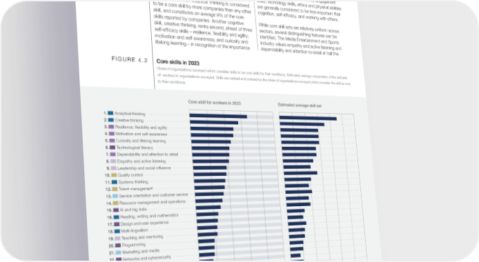 COVID-19 is driving industry transformation (see of workers ability to adapt to disrupted workplaces. Chapter 2), the adoption of frontier technologies The fourth self-efficacy skill in the Global Skills (driving transformation in 86% of companies) may Taxonomy, dependability and attention to detail, be expected to drive the evolution of workplace ranks seventh, behind technological literacy. skills across the full spectrum of skills, knowledge, abilities and attitudes, as workers adapt to The core skills top 10 is completed by two attitudes automation and AI. relating to working with others – empathy and active listening and leadership and social influence – and quality control. Constituting 5% of worker skill sets Core skills in 2023 despite ranking tenth, quality control is an example of a skill particularly important to a limited cohort of businesses. Management skills, engagement Figure 4.2 shows the core skills required by workers skills, technology skills, ethics and physical abilities today. As in 2020, Analytical Thinking is considered are generally considered to be less important than to be a core skill by more companies than any other cognition, self-efficacy, and working with others. skill, and constitutes on average 9% of the core skills reported by companies. Another cognitive While core skill sets are relatively uniform across skill, creative thinking, ranks second, ahead of three sectors, several distinguishing features can be self-efficacy skills – resilience, flexibility and agility; identified. The Media Entertainment and Sports motivation and self-awareness; and curiosity and industry values empathy and active listening and lifelong learning – in recognition of the importance dependability and attention to detail at half the FIGURE 4.2 Core skills in 2023 Share of organizations surveyed which consider skills to be core skills for their workforce. Estimated average composition of the skill sets of workers in organizations surveyed. Skills are ranked and ordered by the share of organizations surveyed which consider the skill as core to their workforce. Core skill for workers in 2023 Estimated average skill set 1. Analytical thinking 2. Creative thinking 3. Resilience, flexibility and agility 4. Motivation and self-awareness 5. Curiosity and lifelong learning 6. Technological literacy 7. Dependability and attention to detail 8. Empathy and active listening 9. Leadership and social influence 10. Quality control 11. Systems thinking 12. Talent management 13. Service orientation and customer service 14. Resource management and operations 15. AI and big data 16. Reading, writing and mathematics 17. Design and user experience 18. Multi-lingualism 19. Teaching and mentoring 20. Programming 21. Marketing and media 22. Networks and cybersecurity 23. Environmental stewardship 24. Manual dexterity, endurance and precision 25. Global citizenship 26. Sensory-processing abilities Cognitive skills Physical abilities 0 20 40 60 80 100 0 2 4 6 8 10 12 Engagement skills Self-efficacy Ethics Technology skills Share of companies (%) Estimated share of skill sets (%) Management skills Working with others Source Note World Economic Forum, Future of Jobs Survey 2023. The Future of Jobs Survey uses the World Economic Forum's Global Skills Taxonomy. Future of Jobs Report 2023 38