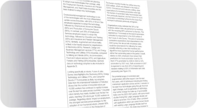enhance jobs.46 Only robots, whether humanoid or The human-machine frontier non-humanoid, are forecast to have a net negative overall impact on employment in our data, with roughly equal cohorts of companies expecting As businesses adopt frontier technologies, tasks growth, displacement and neutral impact. The such as information and data processing are shares of oragnizations surveyed which forecast a increasingly automated, reconfiguring labour neutral impact are not plotted. markets and changing the skills needed for work. Previous editions of the Future of Jobs Report have While respondents operating in different industries documented the shifting frontier between the work show differing preferences for technologies, there tasks performed by humans and those performed are a few industries that show much higher overall by machines and algorithms. We do so again this expectations to adopt new technologies while some year. are more cautious. The Electronics and Chemical and Advanced Materials industries are planning The human-machine frontier has shifted since the to adopt more technologies than average, while 2020 edition, which was released in the midst of the Employment Services, Insurance and Pension COVID-19 lockdowns and remote working, when Management, and Real Estate industries are the expectations for increasing automation were high. least inclined to adopt new technologies. The fraction of automated tasks has increased less than previously expected, and the horizon for future Environmental management technology is one automation is stretching further into the future than of the technologies with the most differentiated surveyed businesses previously anticipated. uptake across industries, with 93% of Oil and Gas employers expected to adopt the technology, Organizations today estimate that 34% of all followed by Chemical and Advanced Materials business-related tasks are performed by machines, (88%) and Production of Consumer Goods with the remaining 66% performed by humans. This (86%). In contrast, just 26% of Employment represents a 1% increase on the level of automation Services employers expect to adopt this estimated by respondents to the 2020 edition of technology, followed by Education and Training the Future of Jobs Survey. This pace of automation (36%) and Insurance and Pension Management contradicts expectations from respondents to the (42%). Similarly, augmented and virtual reality 2020 survey that almost half of business tasks is likely to be heavily adopted by organizations would be automated in the following five years, in Electronics (80%); Research, Design and possibly reflecting a view that machines and Business Management services (77%); and Energy algorithms have augmented human performance Technology and Utilities (75%) industries, compared rather than automating tasks in this period. Overall, to Mining and Metals (46%); Accommodation, relative to 2020, employers have revised their Food and Leisure services (42%); and Agriculture, predictions for future automation down by 5% Forestry and Fishing (30%) industries. Sectoral (from 47% automation by 2025 in 2020 to 42% data on technology adoption is also included in automation by 2027 now). Task automation in 2027 Appendix B. is expected to vary from 35% of reasoning and decision-making to 65% of information and data Looking specifically at robots, Future of Jobs processing (see Figure 2.6). Survey data highlights the Electronics (83%), Energy Technology and Utilities (72%), and Consumer The potential scope of automation and Goods (71%) industries as likely top adopters. augmentation will further expand over the next Data from the International Federation of Robotics few years, with AI techniques maturing and finding shows that the number of industrial robots per mainstream application across sectors. It remains to 10,000 workers has continued to rapidly increase be seen how technologies going through the most 47 over the last five years across countries. Industrial rapid changes, such as generative AI technology, robot density has nearly doubled over the last five may further change the make-up of automatable years, reaching 126 robots per 10,000 workers on tasks over the 2023–2027 period, with some recent average. Regarding robots’ impact on employment, studies finding that Large Language Models can the strongest sectoral picture emerges for the already automate 15% of tasks. When combined adoption of non-humanoid robots, wherein 60% with applications which can correct known issues of companies operating in the Production of with existing Large Language Models (such as Consumer Goods and the Oil and Gas industry factual inaccuracies), this share may increase to foresee job displacement, and 60% of companies 50%.48 operating in Information and Technology services foresee job creation in the next five years. Future of Jobs Report 2023 26