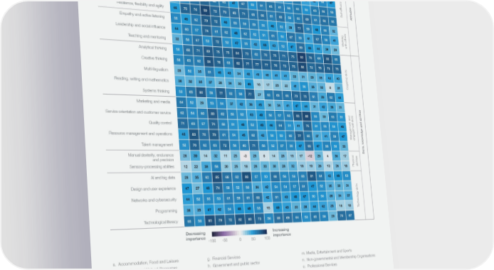 FIGURE C2 Skill evolution, 2023-2027 Net difference between the shares of organizations which consider skills to be increasing and decreasing in importance to their workers from 2023 to 2027 (%). The share of organizations predicting skill stability is not used in the calculation. a b c d e f g h i j k l m n o p q r Environmental stewardship 28 67 43 53 28 67 34 40 39 37 57 57 28 47 25 35 52 45 Global citizenship 25 35 30 26 28 35 9 38 21 25 34 27 22 29 25 22 10 21 Ethics Curiosity and lifelong learning 49 67 81 90 76 61 71 73 65 64 63 70 67 77 73 67 74 57 Dependability and attention to detail 47 54 76 74 61 55 51 64 47 53 53 50 53 63 42 42 54 47 ficacy Motivation and self-awareness 49 58 67 74 65 63 47 67 50 61 65 61 58 63 50 63 66 59 Self-ef Attitudes Resilience, flexibility and agility 46 75 76 90 73 70 69 71 66 68 61 68 56 63 69 61 68 65 Empathy and active listening 55 46 62 79 72 46 59 59 59 53 46 53 38 77 59 48 60 32 Leadership and social influence 44 60 57 74 61 62 48 62 52 51 61 50 67 59 41 67 58 41 orking W with others Teaching and mentoring 32 58 67 53 72 52 47 55 42 49 43 52 47 69 49 44 39 29 Analytical thinking 50 68 71 80 75 75 84 73 62 70 75 71 75 93 76 64 83 65 Creative thinking 56 63 62 84 76 63 82 77 77 77 76 73 75 88 72 76 78 75 Multi-lingualism 28 52 35 61 45 43 34 43 41 40 41 41 33 31 33 35 43 40 Reading, writing and mathematics 36 32 35 37 28 34 30 46 16 17 23 22 41 50 35 32 8 31 Cognitive skills Systems thinking 53 65 80 58 77 62 58 77 27 63 66 66 73 75 61 39 62 44 Marketing and media 64 52 29 53 54 37 42 38 45 30 34 41 47 44 31 42 39 31 Service orientation and customer service 62 54 60 80 62 55 52 43 48 56 57 60 83 88 55 30 63 51 Quality control 71 63 57 74 58 51 46 52 49 46 64 51 41 75 51 55 50 46 Resource management and operations 45 83 70 79 61 54 45 62 42 50 50 60 77 65 37 41 59 47 Management andengagement skills Talent management 52 76 62 63 72 56 60 71 58 52 57 56 47 69 47 58 50 33 Manual dexterity, endurance Skills, knowledge and abilities 26 39 14 32 11 25 -3 29 6 14 26 19 17 -12 29 4 36 17 and precision Sensory-processing abilities 12 22 38 58 20 25 18 29 30 30 28 32 19 19 26 13 26 18 Physicalabilities AI and big data 29 35 62 85 68 62 86 57 50 68 56 56 60 81 64 42 49 53 Design and user experience 47 27 48 74 58 52 56 36 42 54 54 57 61 47 52 35 33 31 Networks and cybersecurity 44 52 55 53 61 59 61 68 42 61 43 48 47 50 50 36 34 37 Programming 36 35 47 42 54 48 48 55 15 49 43 33 38 44 42 35 16 18 echnology skills T Technological literacy 65 56 85 79 72 82 80 73 56 69 69 64 53 65 58 29 70 67 Decreasing Increasing importance -100 -50 0 50 100 importance a. Accommodation, Food and Leisure g. Financial Services m. Media, Entertainment and Sports b. Agriculture and Natural Resources h. Government and public sector n. Non-governmental and Membership Organisations c. Automotive and Aerospace i. Health and healthcare o. Professional Services d. Care, Personal Services and Wellbeing j. Information Technology and Digital Communications p. Real estate e. Education and training k. Infrastructure q. Retail and wholesale of consumer goods f. Energy and Materials l. Manufacturing r. Supply chain and transportation Source World Economic Forum, Future of Jobs Survey 2023. Future of Jobs Report 2023 80