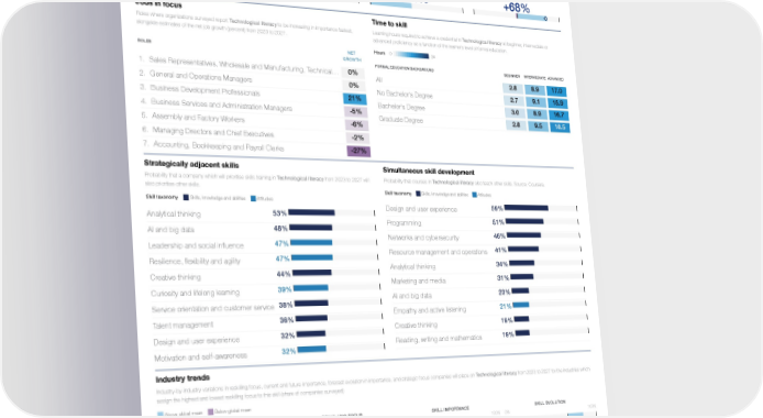 Skill Profile Reskilling Ranking Technological literacy 7th Skills, knowledge and abilities Technology skills Technological literacy Global Skills Taxonomy / / Five year trend Reskilling focus Skill importance Skill evolution Learning hours spent pursuing assessements and Companies for which Technological literacy is a Companies for which Technological literacy is a Share of companies for which Technological credentials in Technological literacy from 2017 to priority in their upskilling and reskilling programmes core skill for workers (share of companies surveyed) literacy is increasing or decreasing in importance 2022 (share of total learning hours). Source: for 2023-2027 (share of companies surveyed) at work. White diamond and label represent net Coursera share. 6% 28% 44% +68% 0% 2017 2022 Jobs in focus Time to skill Roles where organizations surveyed report Technological literacy to be increasing in importance fastest, Learning hours required to achieve a credential in Technological literacy at beginner, intermediate or alongside estimates of the net job growth (percent) from 2023 to 2027. advanced proficiency as a function of the learner’s level of formal education. Hours 0 34 NET ROLES GROWTH FORMAL EDUCATION BACKGROUND BEGINNER INTERMEDIATE ADVANCED 0% 1. Sales Representatives, Wholesale and Manufacturing, Technical … 2.8 8.9 17.0 All 0% 2. General and Operations Managers 2.7 9.1 15.9 No Bachelor's Degree 21% 3. Business Development Professionals 3.0 8.9 16.7 Bachelor's Degree -5% 4. Business Services and Administration Managers 2.8 9.5 18.5 Graduate Degree -6% 5. Assembly and Factory Workers -2% 6. Managing Directors and Chief Executives -27% 7. Accounting, Bookkeeping and Payroll Clerks Strategically adjacent skills Simultaneous skill development Probability that a company which will prioritise skills training in Technological literacy from 2023 to 2027 will Probability that courses in Technological literacy also teach other skills. Source: Coursera. also prioritise other skills. Skill taxonomy Skills, knowledge and abilities Attitudes Skill taxonomy Skills, knowledge and abilities Attitudes 59% Design and user experience 53% Analytical thinking 51% Programming 48% AI and big data 46% Networks and cybersecurity 47% Leadership and social influence 41% Resource management and operations 47% Resilience, flexibility and agility 34% Analytical thinking 44% Creative thinking 31% Marketing and media 39% Curiosity and lifelong learning 23% AI and big data 38% Service orientation and customer service 21% Empathy and active listening 36% Talent management 19% Creative thinking 32% Design and user experience 19% Reading, writing and mathematics 32% Motivation and self-awareness Industry trends Industry-by-industry variations in reskilling focus, current and future importance, forecast evolution in importance, and strategic focus companies will place on Technological literacy from 2023 to 2027 for the industries which assign the highest and lowest reskilling focus to this skill (share of companies surveyed) Above global mean Below global mean RESKILLING FOCUS SKILL IMPORTANCE SKILL EVOLUTION INDUSTRY 0% 100% 0% 100% 0% 100% Automotive and Aerospace Supply chain and transportation Education and training Oil and gas Real estate Electronics