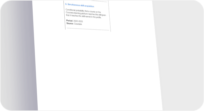 workforce development in this skill, given that it 10. Industry trends: will prioritize workforce development in the skill named in the profile. The probability is calculated This table shows variations between sectors in the based on responses to the question, “Keeping in reskilling focus, current importance and evolving mind your current strategic direction, please select importance of the named skill. Among the 27 the skill clusters on which you are focusing your industries accessible within the data, the top organization’s reskilling and upskilling efforts in the three and bottom three industries are visualised, next five years” according to the reskilling focus from 2023 to 2027. Period: 2022-2023 Period: 2022-2023 Source: World Economic Forum, Future of Jobs Source: World Economic Forum, Future of Jobs Survey Survey 9. Simultaneous skill acquisition Conditional probability that a course on the Coursera learning platform teaches this skill given that it teaches the skill named in the profile. Period: 2022-2023 Source: Coursera Future of Jobs Report 2023 260