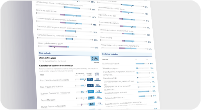 Economy Profile Working Age Population (Millions) 1 / 2 United Kingdom 46.4 Trend outlook Global trends and their impact on job creation Technologies and their impact on job creation Trends most most likely to drive industry transformation and their expected impact job creation, ordered by net Technologies most most likely to drive industry transformation and their expected impact job creation, ordered effect (share of organizations surveyed) by net effect (share of organizations surveyed) Job creator Job displacer Net effect Global net effect Job creator Job displacer Net effect Global net effect Broader application of Environmental, Social and Governance (ESG) standards Big-data analytics -100% +100% -100% +100% 60% 53% Investments to facilitate the green transition of your business Encryption and cybersecurity -100% +100% -100% +100% 59% 52% Climate-change induced investments into adapting operations Internet of things and connected devices -100% +100% -100% +100% 56% 43% Broadening digital access Digital platforms and apps -100% +100% -100% +100% 44% 41% Increased adoption of new and frontier technologies E-commerce and digital trade -100% +100% -100% +100% 43% 41% Consumers becoming more vocal on environmental issues Education and workforce development technologies -100% +100% -100% +100% 35% 39% Consumers becoming more vocal on social issues Cloud computing -100% +100% -100% +100% 23% 33% Slower global economic growth Artificial intelligence (e.g. machine learning, neural networks) -100% +100% -100% +100% -56% 24% Role outlook Contextual indicators Churn in five years INDICATORS 0% 100% 21% Five-year structural labour-force churn (percent) Global 23% Labour force participation 64% Key roles for business transformation Roles most selected by organizations surveyed (as either growing, stable or declining), ordered by net role Vulnerable employment 13% growth, and their net growth and structural churn (percent) Share of youth not in employment, education, or NET GROWTH ECONOMY GLOBAL 11% ROLES -50% 0 50% CHURN CHURN training (NEET) Unemployment rate 3% 38% 40% AI and Machine Learning Specialists Unemployment rate among workers with basic 5% edu. 41% 34% Data Analysts and Scientists Unemployment rate among workers with 2% advanced edu. 26% 24% Business Development Professionals Secondary Education Attainment 80% 18% 25% Project Managers Tertiary Education Attainment 47% 15% 12% Human Resources Specialists Ease of finding skilled employees in local labour market 4.26 1=Companies cannot easily find skilled employees, 7=Companies can easily find skilled employees 16% 14% General and Operations Managers Fill vacancies by hiring foreign labour 3.99 1=Companies cannot fill vacancies by hiring foreign labour, 7=Companies can fill vacancies by hiring foreign labour 19% 19% Accountants and Auditors Country investment in mid-career training 4.27 1=Government does not invest in mid-career training, 7=Government invests in mid-career training 20% 17% Assembly and Factory Workers Workers' Rights Index 3 36% 42% Data Entry Clerks 5+=No guarantee of rights due to the breakdown of the rule of law, 1=Sporadic violations of rights Level of National Compliance with Labour Rights Accounting, Bookkeeping and Payroll 29% 29% 1 10=The worst possible score, lower levels of compliance, 0=The best possible score, higher levels of Clerks compliance