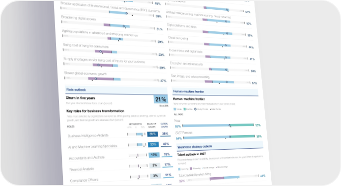 Industry Profile Global Employee (millions, ILO estimates) 1 / 2 Business support and premises maintenance services 23.8 Trend outlook Global trends and their impact on job creation Technologies and their impact on job creation Trends most most likely to drive industry transformation and their expected impact job creation, ordered by net Technologies most most likely to drive industry transformation and their expected impact job creation, ordered effect (share of organizations surveyed) by net effect (share of organizations surveyed) Job creator Job displacer Net effect Global net effect Job creator Job displacer Net effect Global net effect Consumers becoming more vocal on social issues Internet of things and connected devices -100% +100% -100% +100% 56% 63% Increased adoption of new and frontier technologies Big-data analytics -100% +100% -100% +100% 40% 56% Broader application of Environmental, Social and Governance (ESG) standards Artificial intelligence (e.g. machine learning, neural networks) -100% +100% -100% +100% 39% 50% Broadening digital access Digital platforms and apps -100% +100% -100% +100% 31% 50% Ageing populations in advanced and emerging economies Cloud computing -100% +100% -100% +100% 20% 44% Rising cost of living for consumers E-commerce and digital trade -100% +100% -100% +100% -23% 41% Supply shortages and/or rising cost of inputs for your business Encryption and cybersecurity -100% +100% -100% +100% -29% 39% Slower global economic growth Text, image, and voice processing -100% +100% -100% +100% -37% 37% Role outlook Human-machine frontier Churn in five years Human-machine frontier 21% Five-year structural labour-force churn (percent) Tasks performed by humans and machines today and in 2027 (share of total) Global 23% Human Machine Industry Frontier Global Frontier Key roles for business transformation ALL TASKS Roles most selected by organizations surveyed (as either growing, stable or declining), ordered by net role growth, and their net growth and structural churn (percent) Now NET GROWTH INDUSTRY GLOBAL ROLES -50% 0 50% CHURN CHURN 65% 35% 2027 Forecast 36% 35% Business Intelligence Analysts 64% 36% 30% 40% AI and Machine Learning Specialists Workforce strategy outlook 13% 19% Accountants and Auditors Talent outlook in 2027 Expected change in talent availability, development and retention in the next five years (share of organizations surveyed) 2% 17% Financial Analysts Improving Worsening Global average Global average 3% 21% Compliance Officers Talent availability when hiring -100% +100% 39% 44% 4% 12% Human Resources Specialists Talent development of existing workforce Accounting, Bookkeeping and Payroll -100% +100% 6% 72% 26% 29% Clerks Talent retention of existing workforce -100% +100% 17% 56%