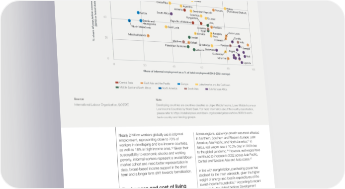 FIGURE 1.5 Informal employment and social protection coverage in developing countries 100 Mongolia Guyana Georgia Bulgaria 80 Türkiye Albania otection Brazil Mexico 60 Costa Rica Argentina Bolivia Vanuatu (Plurinational State of) ed by social pr Armenia Dominican Republic Serbia South Africa Colombia Ecuador Kyrgyzstan Republic of Moldova Iraq 40 Bosnia and Viet Nam Herzegovina Saint Lucia Sri Lanka (2018 or latest data available) North Macedonia Egypt Paraguay Timor-Leste Jamaica Peru Zambia e of population cover Marshall Islands Jordan Indonesia India 20 Maldives Kiribati El Salvador Pakistan % shar Palestinian Territories Senegal Lebanon Botswana Angola Guatemala Mali Myanmar 0 Uganda 0 20 40 60 80 100 Share of informal employment as a % of total employment (2019-2021 average) Central Asia East Asia and the Pacific Europe Latin America and the Caribbean Middle East and North Africa North America South Asia Sub-Saharan Africa Source Note International Labour Organization, ILOSTAT. Developing countries are countries classified as Upper Middle Income, Lower Middle Income or Low Income Countries by World Bank. For more information about the country classification, please refer to https://datahelpdesk.worldbank.org/knowledgebase/articles/906519-world- bank-country-and-lending-groups. Nearly 2 billion workers globally are in informal Across regions, real wage growth was most affected employment, representing close to 70% of in Northern, Southern and Western Europe; Latin 18 workers in developing and low-income countries, America; Asia Pacific; and North America. In 13 as well as 18% in high income ones. Given their Africa, real wages saw a 10.5% drop in 2020 due 19 susceptibility to economic shocks and working to the global pandemic. However, real wages have poverty, informal workers represent a crucial labour- continued to increase in 2022 across Asia Pacific, 20 market cohort and need better representation in Central and Western Asia and Arab states. data, broad-based income support in the short term and a longer term shift towards formalization. In line with rising inflation, purchasing power has declined for the most vulnerable, given the higher weight of energy and food in expenditures of the 21 Real wages and cost of living lowest-income households. According to recent research by the United Nations Development Programme (UNDP), rising food and energy prices According to the International Labour Organization could push up to 71 million people into poverty, (ILO), labour income in many developing countries with hot spots in Sub-Saharan Africa, the Balkans 14 22 remains below pre-pandemic levels. In 2020, the and the Caspian Basin. This cost-of-living crisis global economy started experiencing inflation levels highlights the importance of designing permanent 15 not seen in almost 40 years. With high inflation, models of social protection for non-standard the global cost-of-living crisis has hit the most employment and the informal economy that provide vulnerable hardest.16 According to the ILO, for the security and support resilience.23 first time over the last 15 years, workers’ real wages 17 have declined – by 0.9% in the first half of 2022. Future of Jobs Report 2023 14