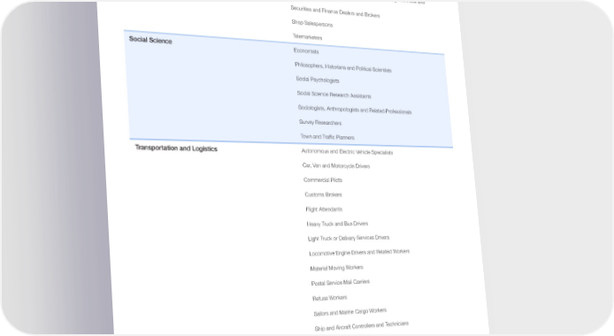 TABLE A3 Job taxonomy The occupational taxonomy was modified and extended from O*NET SOC. Job family Occupation Sales Door-To-Door Sales Workers, News and Street Vendors, and Related Workers Real Estate Sales Agents Sales and Purchasing Agents and Brokers Sales Representatives, Wholesale and Manufacturing, Technical and Scientific Products Securities and Finance Dealers and Brokers Shop Salespersons Telemarketers Social Science Economists Philosophers, Historians and Political Scientists Social Psychologists Social Science Research Assistants Sociologists, Anthropologists and Related Professionals Survey Researchers Town and Traffic Planners Transportation and Logistics Autonomous and Electric Vehicle Specialists Car, Van and Motorcycle Drivers Commercial Pilots Customs Brokers Flight Attendants Heavy Truck and Bus Drivers Light Truck or Delivery Services Drivers Locomotive Engine Drivers and Related Workers Material Moving Workers Postal Service Mail Carriers Refuse Workers Sailors and Marine Cargo Workers Ship and Aircraft Controllers and Technicians Ship and Boat Captains Supply Chain and Logistics Specialists Transportation Attendants and Conductors Transportation Inspectors Vehicle and Mobile Equipment Mechanics, Installers, and Repairers Weighers, Measurers, Checkers, and Samplers, Recordkeeping Future of Jobs Report 2023 74