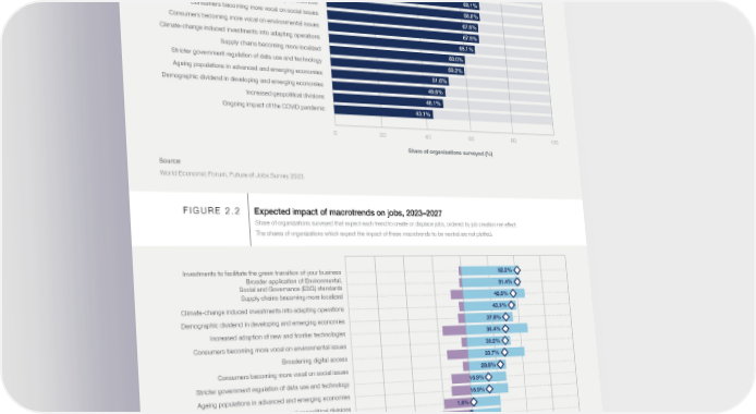 FIGURE 2.1 Macrotrends driving business transformation Trends ranked by share of organizations surveyed that identified this trend as likely or increasingly likely to drive transformation in their organization. Increased adoption of new and frontier technologies 86.2% Broadening digital access 86.1% Broader application of Environmental, 80.6% Social and Governance (ESG) standards Rising cost of living for consumers 74.9% Slower global economic growth 73.0% Investments to facilitate the green transition of your business 69.1% Supply shortages and/or rising cost of inputs for your business 68.8% Consumers becoming more vocal on social issues 67.6% Consumers becoming more vocal on environmental issues 67.5% Climate-change induced investments into adapting operations 65.1% Supply chains becoming more localized 60.0% Stricter government regulation of data use and technology 59.2% Ageing populations in advanced and emerging economies 51.6% Demographic dividend in developing and emerging economies 49.6% Increased geopolitical divisions 48.1% Ongoing impact of the COVID pandemic 43.1% 0 20 40 60 80 100 Share of organizations surveyed (%) Source World Economic Forum, Future of Jobs Survey 2023. FIGURE 2.2 Expected impact of macrotrends on jobs, 2023–2027 Share of organizations surveyed that expect each trend to create or displace jobs, ordered by job creation net effect. The shares of organizations which expect the impact of these macrotrends to be neutral are not plotted. Investments to facilitate the green transition of your business 52.2% Broader application of Environmental, 51.4% Social and Governance (ESG) standards Supply chains becoming more localized 46.5% Climate-change induced investments into adapting operations 43.9% Demographic dividend in developing and emerging economies 37.8% Increased adoption of new and frontier technologies 36.4% Consumers becoming more vocal on environmental issues 35.2% Broadening digital access 33.7% Consumers becoming more vocal on social issues 28.8% Stricter government regulation of data use and technology 16.9% Ageing populations in advanced and emerging economies 16.9% Increased geopolitical divisions 1.6% Ongoing impact of the COVID pandemic -0.9% Rising cost of living for consumers -19.3% Supply shortages and/or rising cost of inputs for your business -23.7% Slower global economic growth -44.4% -100 -75 -50 -25 0 +25 +50 +75 +100 Share of organizations surveyed (%) Job creator Job displacer Net effect Source World Economic Forum, Future of Jobs Survey 2023. Future of Jobs Report 2023 21