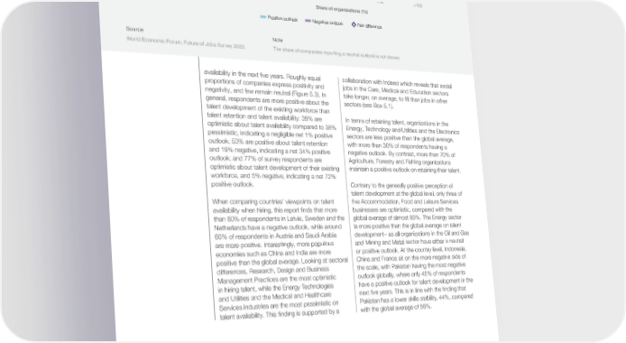 FIGURE 5.3 Talent outlook, 2023-2027 Share of organizations surveyed reporting a positive and negative outlook for talent availability, development and retention from 2023 to 2027, and the net difference. Talent availability when hiring +0.6% Talent development of existing workforce +72.2% Talent retention of existing workforce +33.9% -100 -50 0 +50 +100 Share of organizations (%) Positive outlook Negative outlook Net difference Source Note World Economic Forum, Future of Jobs Survey 2023. The share of companies reporting a neutral outlook is not shown. availability in the next five years. Roughly equal collaboration with Indeed which reveals that social proportions of companies express positivity and jobs in the Care, Medical and Education sectors negativity, and few remain neutral (Figure 5.3). In take longer, on average, to fill than jobs in other general, respondents are more positive about the sectors (see Box 5.1). talent development of the existing workforce than talent retention and talent availability: 39% are In terms of retaining talent, organizations in the optimistic about talent availability compared to 38% Energy, Technology and Utilities and the Electronics pessimistic, indicating a negligible net 1% positive sectors are less positive than the global average, outlook; 53% are positive about talent retention with more than 30% of respondents having a and 19% negative, indicating a net 34% positive negative outlook. By contrast, more than 70% of outlook; and 77% of survey respondents are Agriculture, Forestry and Fishing organizations optimistic about talent development of their existing maintain a positive outlook on retaining their talent. workforce, and 5% negative, indicating a net 72% positive outlook. Contrary to the generally positive perception of talent development at the global level, only three of When comparing countries’ viewpoints on talent five Accommodation, Food and Leisure Services availability when hiring, this report finds that more businesses are optimistic, compared with the than 60% of respondents in Latvia, Sweden and the global average of almost 80%. The Energy sector Netherlands have a negative outlook, while around is more positive than the global average on talent 60% of respondents in Austria and Saudi Arabia development– as all organizations in the Oil and Gas are more positive. Interestingly, more populous and Mining and Metal sector have either a neutral economies such as China and India are more or positive outlook. At the country level, Indonesia, positive than the global average. Looking at sectoral China and France sit on the more negative side of differences, Research, Design and Business the scale, with Pakistan having the most negative Management Practices are the most optimistic outlook globally, where only 45% of respondents in hiring talent, while the Energy Technologies have a positive outlook for talent development in the and Utilities and the Medical and Healthcare next five years. This is in line with the finding that Services industries are the most pessimistic on Pakistan has a lower skills stability, 44%, compared talent availability. This finding is supported by a with the global average of 56%. Future of Jobs Report 2023 51