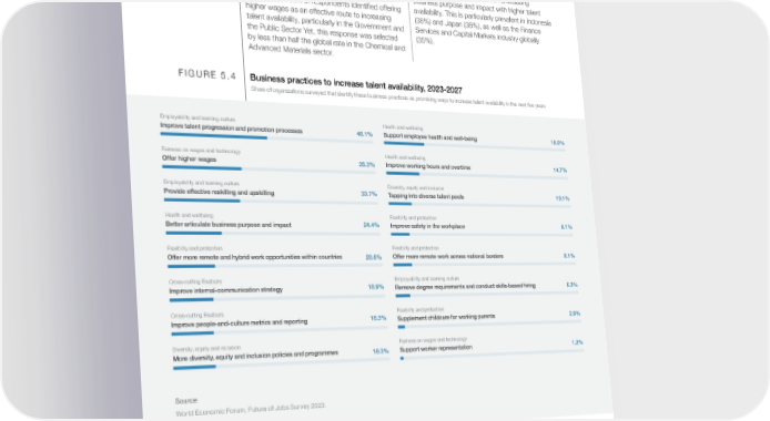 5.2 Talent availability and retention As presented in Figure 5.4, businesses consider While 81% of companies consider investing in improving talent progression and promotion learning and on-the-job training to be a key strategy processes to be the most promising way to for delivering their business goals (see Figure 5.2), increase the availability of talent in their organization. only 34% consider providing reskilling and upskilling In fact, 48% of respondents identified this business to be a way to increase talent availability specifically. practice, with particularly high response rates in the Automotive and Aerospace and Production of Ranked the fourth highest business practice, Consumer Goods sectors. executives see the link between articulating business purpose and impact with higher talent Thirty-five percent of respondents identified offering availability. This is particularly prevalent in Indonesia higher wages as an effective route to increasing (38%) and Japan (38%), as well as the Finance talent availability, particularly in the Government and Services and Capital Markets industry globally the Public Sector Yet, this response was selected (35%). by less than half the global rate in the Chemical and Advanced Materials sector. FIGURE 5.4 Business practices to increase talent availability, 2023-2027 Share of organizations surveyed that identify these business practices as promising ways to increase talent availability in the next five years Employability and learning culture Health and wellbeing Improve talent progression and promotion processes 48.1% Support employee health and well-being 18.0% Fairness on wages and technology Health and wellbeing Offer higher wages 35.3% Improve working hours and overtime 14.7% Employability and learning culture Diversity, equity and inclusion Provide effective reskilling and upskilling 33.7% Tapping into diverse talent pools 10.1% Health and wellbeing Flexibility and protection Better articulate business purpose and impact 24.4% Improve safety in the workplace 8.1% Flexibility and protection Flexibility and protection Offer more remote and hybrid work opportunities within countries 20.5% Offer more remote work across national borders 8.1% Cross-cutting Enablers Employability and learning culture Improve internal-communication strategy 18.9% Remove degree requirements and conduct skills-based hiring 6.3% Cross-cutting Enablers Flexibility and protection Improve people-and-culture metrics and reporting 18.3% Supplement childcare for working parents 2.9% Diversity, equity and inclusion Fairness on wages and technology More diversity, equity and inclusion policies and programmes 18.3% Support worker representation 1.2% Source World Economic Forum, Future of Jobs Survey 2023. In fact, possessing an effective employee training are seen as more attractive to prospective talent programme is seen as the top talent-attracting than well-communicated impact; remote and hybrid policy available to businesses in the Business work; DEI policies; supporting employee health and Support and Premises Maintenance Services; well-being; improving working hours; tapping into Employment Services; Insurance and Pensions diverse talent pools; skills-based hiring; childcare Management; and Research, Design and Business support; or support for worker representation. Management Services industries, though only Although, globally, only one-third of companies 17% of the Mining and Metals sector see this identify a robust training dispensation as attractive as an effective way to increase talent availability. to prospective employees, this figure rises to 40% Across the board, effective training opportunities among SMEs. Future of Jobs Report 2023 53