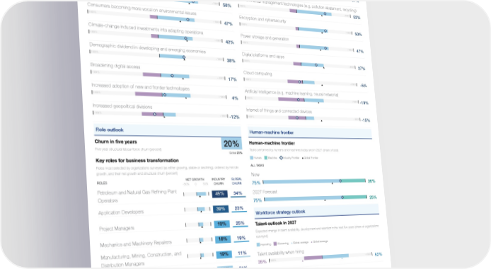 Industry Profile Global Employee (millions, ILO estimates) 1 / 2 Oil and gas 6.1 Trend outlook Global trends and their impact on job creation Technologies and their impact on job creation Trends most most likely to drive industry transformation and their expected impact job creation, ordered by net Technologies most most likely to drive industry transformation and their expected impact job creation, ordered effect (share of organizations surveyed) by net effect (share of organizations surveyed) Job creator Job displacer Net effect Global net effect Job creator Job displacer Net effect Global net effect Investments to facilitate the green transition of your business Climate-change mitigation technology (Alternative Energy, Greenhouse gases … -100% +100% -100% +100% 74% 61% Broader application of Environmental, Social and Governance (ESG) standards Environmental management technologies (e.g. pollution abatement, recycling) -100% +100% -100% +100% 58% 52% Consumers becoming more vocal on environmental issues Encryption and cybersecurity -100% +100% -100% +100% 47% 50% Climate-change induced investments into adapting operations Power storage and generation -100% +100% -100% +100% 42% 47% Demographic dividend in developing and emerging economies Digital platforms and apps -100% +100% -100% +100% 38% 27% Broadening digital access Cloud computing -100% +100% -100% +100% 17% -5% Increased adoption of new and frontier technologies Artificial intelligence (e.g. machine learning, neural networks) -100% +100% -100% +100% 4% -10% Increased geopolitical divisions Internet of things and connected devices -100% +100% -100% +100% -12% -15% Role outlook Human-machine frontier Churn in five years Human-machine frontier 20% Five-year structural labour-force churn (percent) Tasks performed by humans and machines today and in 2027 (share of total) Global 23% Human Machine Industry Frontier Global Frontier Key roles for business transformation ALL TASKS Roles most selected by organizations surveyed (as either growing, stable or declining), ordered by net role growth, and their net growth and structural churn (percent) Now NET GROWTH INDUSTRY GLOBAL ROLES -50% 0 50% CHURN CHURN 75% 26% Petroleum and Natural Gas Refining Plant 2027 Forecast 45% 34% Operators 75% 25% 39% 23% Application Developers Workforce strategy outlook 19% 25% Project Managers Talent outlook in 2027 Expected change in talent availability, development and retention in the next five years (share of organizations surveyed) 18% 19% Mechanics and Machinery Repairers Improving Worsening Global average Global average Manufacturing, Mining, Construction, and 19% 11% Talent availability when hiring Distribution Managers -100% +100% 35% 52% 11% 31% Big Data Specialists Talent development of existing workforce -100% +100% 0% 78% 14% 19% Accountants and Auditors Talent retention of existing workforce 3% 14% General and Operations Managers -100% +100% 22% 39% Sales Representatives, Wholesale and 4% 14% … Manufacturing, Technical and Scientific Accounting, Bookkeeping and Payroll 6% 29% Clerks 31% 42% Data Entry Clerks 38% 35% Administrative and Executive Secretaries