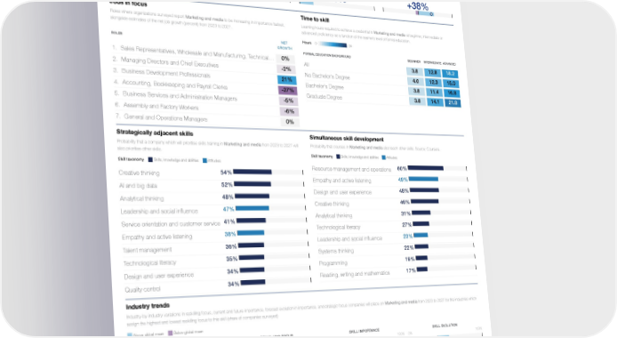 Skill Profile Reskilling Ranking Marketing and media 15th Skills, knowledge and abilities Engagement skills Marketing and media Global Skills Taxonomy / / Five year trend Reskilling focus Skill importance Skill evolution Learning hours spent pursuing assessements and Companies for which Marketing and media is a Companies for which Marketing and media is a Share of companies for which Marketing and credentials in Marketing and media from 2017 to priority in their upskilling and reskilling programmes core skill for workers (share of companies surveyed) media is increasing or decreasing in importance 2022 (share of total learning hours). Source: for 2023-2027 (share of companies surveyed) at work. White diamond and label represent net Coursera share. 5% 18% 18% +38% 0% 2017 2022 Jobs in focus Time to skill Roles where organizations surveyed report Marketing and media to be increasing in importance fastest, Learning hours required to achieve a credential in Marketing and media at beginner, intermediate or alongside estimates of the net job growth (percent) from 2023 to 2027. advanced proficiency as a function of the learner’s level of formal education. Hours 0 34 NET ROLES GROWTH FORMAL EDUCATION BACKGROUND BEGINNER INTERMEDIATE ADVANCED 0% 1. Sales Representatives, Wholesale and Manufacturing, Technical … 3.8 12.8 18.2 All -2% 2. Managing Directors and Chief Executives 4.0 12.3 15.0 No Bachelor's Degree 21% 3. Business Development Professionals 3.8 11.4 16.8 Bachelor's Degree -27% 4. Accounting, Bookkeeping and Payroll Clerks 3.8 14.1 21.8 Graduate Degree -5% 5. Business Services and Administration Managers -6% 6. Assembly and Factory Workers 0% 7. General and Operations Managers Strategically adjacent skills Simultaneous skill development Probability that a company which will prioritise skills training in Marketing and media from 2023 to 2027 will Probability that courses in Marketing and media also teach other skills. Source: Coursera. also prioritise other skills. Skill taxonomy Skills, knowledge and abilities Attitudes Skill taxonomy Skills, knowledge and abilities Attitudes 60% Resource management and operations 54% Creative thinking 49% Empathy and active listening 52% AI and big data 48% Design and user experience 48% Analytical thinking 46% Creative thinking 47% Leadership and social influence 31% Analytical thinking 41% Service orientation and customer service 27% Technological literacy 38% Empathy and active listening 23% Leadership and social influence 36% Talent management 22% Systems thinking 35% Technological literacy 19% Programming 34% Design and user experience 17% Reading, writing and mathematics 34% Quality control Industry trends Industry-by-industry variations in reskilling focus, current and future importance, forecast evolution in importance, and strategic focus companies will place on Marketing and media from 2023 to 2027 for the industries which assign the highest and lowest reskilling focus to this skill (share of companies surveyed) Above global mean Below global mean RESKILLING FOCUS SKILL IMPORTANCE SKILL EVOLUTION INDUSTRY 0% 100% 0% 100% 0% 100% Education and training Research, design and business management services Media, Entertainment and Sports Oil and gas Business support and premises maintenance services Energy technology and utilities