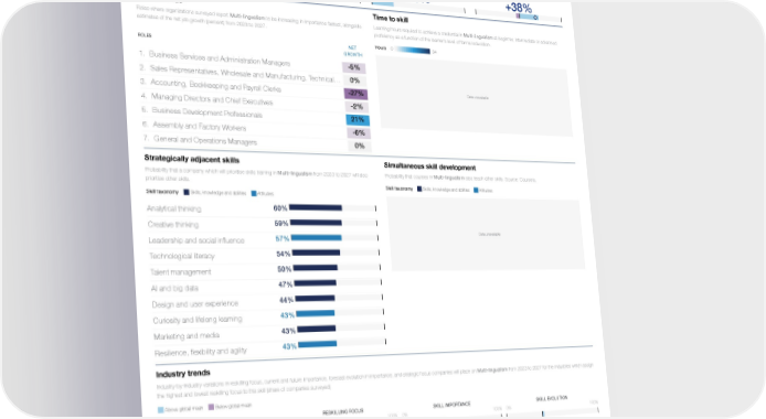 Skill Profile Reskilling Ranking Multi-lingualism 22nd Skills, knowledge and abilities Cognitive skills Multi-lingualism Global Skills Taxonomy / / Five year trend Reskilling focus Skill importance Skill evolution Learning hours spent pursuing assessements and Companies for which Multi-lingualism is a priority Companies for which Multi-lingualism is a core Share of companies for which Multi-lingualism is credentials in Multi-lingualism from 2017 to 2022 in their upskilling and reskilling programmes for skill for workers (share of companies surveyed) increasing or decreasing in importance at work. (share of total learning hours). Source: Coursera 2023-2027 (share of companies surveyed) White diamond and label represent net share. 11% 23% +38% Data unavailable Jobs in focus Time to skill Roles where organizations surveyed report Multi-lingualism to be increasing in importance fastest, alongside Learning hours required to achieve a credential in Multi-lingualism at beginner, intermediate or advanced estimates of the net job growth (percent) from 2023 to 2027. proficiency as a function of the learner’s level of formal education. Hours 0 34 NET ROLES GROWTH -5% 1. Business Services and Administration Managers 0% 2. Sales Representatives, Wholesale and Manufacturing, Technical … Data unavailable -27% 3. Accounting, Bookkeeping and Payroll Clerks -2% 4. Managing Directors and Chief Executives 21% 5. Business Development Professionals -6% 6. Assembly and Factory Workers 0% 7. General and Operations Managers Strategically adjacent skills Simultaneous skill development Probability that a company which will prioritise skills training in Multi-lingualism from 2023 to 2027 will also Probability that courses in Multi-lingualism also teach other skills. Source: Coursera. prioritise other skills. Skill taxonomy Skills, knowledge and abilities Attitudes Skill taxonomy Skills, knowledge and abilities Attitudes 60% Analytical thinking 59% Creative thinking Data unavailable 57% Leadership and social influence 54% Technological literacy 50% Talent management 47% AI and big data 44% Design and user experience 43% Curiosity and lifelong learning 43% Marketing and media 43% Resilience, flexibility and agility Industry trends Industry-by-industry variations in reskilling focus, current and future importance, forecast evolution in importance, and strategic focus companies will place on Multi-lingualism from 2023 to 2027 for the industries which assign the highest and lowest reskilling focus to this skill (share of companies surveyed) Above global mean Below global mean RESKILLING FOCUS SKILL IMPORTANCE SKILL EVOLUTION INDUSTRY 0% 100% 0% 100% 0% 100% Employment services Accommodation, Food, and Leisure Production of consumer goods Government and public sector Oil and gas Insurance and pensions management