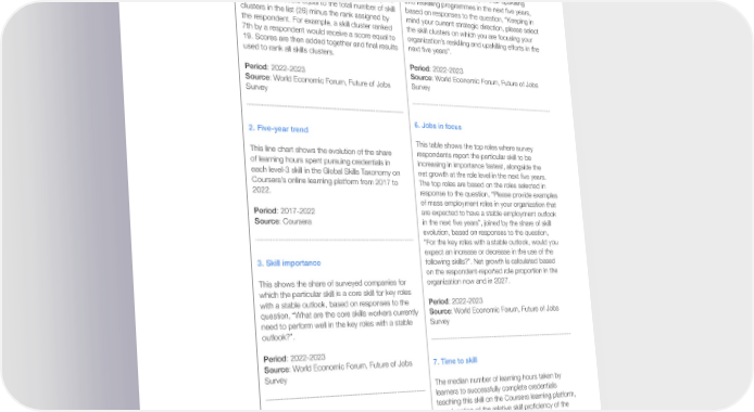1. Reskilling skill focus ranking experiencing decreasing or slightly decreasing use. This is the aggregated ranking using the Borda Period: 2022-2023 method of rankings supplied by surveyed Source: World Economic Forum, Future of Jobs companies regarding their reskilling and upskilling Survey priorities for 2023-2027, based on responses to the question, “Keeping in mind your current strategic direction, please select and rank the skill clusters on which you are focusing your organisation’s reskilling 5. Reskilling focus and upskilling efforts in the next five years”. As respondents selected and ranked different numbers This shows the share of companies for which of skill clusters, the Borda method aggregates the particular skill is a priority in their upskilling results assigning to each skills cluster ranked by the and reskilling programmes in the next five years, respondent a score equal to the total number of skill based on responses to the question, “Keeping in clusters in the list (26) minus the rank assigned by mind your current strategic direction, please select the respondent. For example, a skill cluster ranked the skill clusters on which you are focusing your 7th by a respondent would receive a score equal to organization’s reskilling and upskilling efforts in the 19. Scores are then added together and final results next five years”. used to rank all skills clusters. Period: 2022-2023 Period: 2022-2023 Source: World Economic Forum, Future of Jobs Source: World Economic Forum, Future of Jobs Survey Survey 6. Jobs in focus 2. Five-year trend This table shows the top roles where survey This line chart shows the evolution of the share respondents report the particular skill to be of learning hours spent pursuing credentials in increasing in importance fastest, alongside the each level-3 skill in the Global Skills Taxonomy on net growth at the role level in the next five years. Coursera’s online learning platform from 2017 to The top roles are based on the roles selected in 2022. response to the question, “Please provide examples of mass employment roles in your organization that Period: 2017-2022 are expected to have a stable employment outlook Source: Coursera in the next five years”, joined by the share of skill evolution, based on responses to the question, “For the key roles with a stable outlook, would you expect an increase or decrease in the use of the 3. Skill importance following skills?”. Net growth is calculated based on the respondent-reported role proportion in the This shows the share of surveyed companies for organization now and in 2027. which the particular skill is a core skill for key roles with a stable outlook, based on responses to the Period: 2022-2023 question, “What are the core skills workers currently Source: World Economic Forum, Future of Jobs need to perform well in the key roles with a stable Survey outlook?”. Period: 2022-2023 Source: World Economic Forum, Future of Jobs 7. Time to skill Survey The median number of learning hours taken by learners to successfully complete credentials teaching this skill on the Coursera learning platform, 4. Skill evolution as a function of the relative skill proficiency of the credential and the learner’s self-reported level of This shows the expected increase or decrease in formal education, when it is known. use of a particular skill for the key roles that have a stable outlook in the organization. It is based on Period: 2022-2023 responses to the question, “For the key roles with Source: Coursera a stable outlook, would you expect an increase or decrease in the use of the following skills?”. The net effect is calculated by the share of respondents who select a particular skill as exhibiting increasing 8. Strategically adjacent skills or slightly increasing use, minus the share of respondents who select a particular skill as Conditional probability that a company will prioritize Future of Jobs Report 2023 259