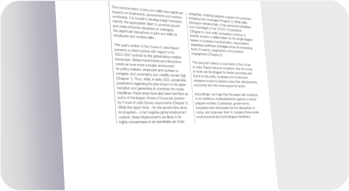 May 2023 Future of Jobs Report 2023 Conclusion The transformation of jobs and skills have significant categories, enabling targeted support and proactive impacts on businesses, governments and workers redeployment strategies (Chapter 3). While skills worldwide. It is crucial to develop insight forecasts, disruption remains high, it has somewhat stabilized identify the appropriate talent to promote growth, from the height of the COVID-19 pandemic and make informed decisions on managing (Chapter 4). And while companies continue to the significant disruptions to jobs and skills for identify access to skilled talent as the single biggest employers and workers alike. barrier to business transformation, expectations regarding workforce strategies show an increasing This year’s edition of the Future of Jobs Report level of nuance, pragmatism and proactive presents a mixed picture with regard to the engagement (Chapter 5). 2023-2027 outlook for the global labour-market landscape. Global macrotrends and disruptions This last point reflects a core tenet of the Future create an ever-more complex environment of Jobs Report since its inception: that the future for policy-makers, employers and workers to of work can be shaped for better outcomes and navigate, and uncertainty and volatility remain high that it is the policy, business and investment (Chapter 1). Thus, while, in early 2023, pessimistic decisions made by leaders today that will determine predictions regarding the jobs impact of the green outcomes and the future space for action. transition and generative AI dominate the media headlines, these areas have also been identified as Accordingly, we hope that this report will contribute some of the largest drivers of future job creation to an ambitious multistakeholder agenda to better by Future of Jobs Survey respondents (Chapter 2). prepare workers, businesses, governments, While the report finds – for the second time since educators and civil society for the disruptions to its inception – a net negative global employment come, and empower them to navigate these social, outlook, these displacements are likely to be environmental and technological transitions. highly concentrated in an identifiable set of job Future of Jobs Report 2023 61