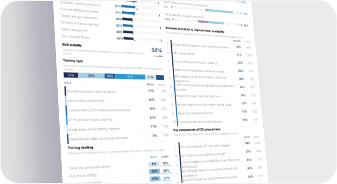 Region Profile / 2 North America Skill outlook :orkIorFe VtrDteJ\ outlook 9esRilling sRill focus Talent outlooR in 6kills most prioritized for reskilling and upskilling in the next ıve years (share of organizations surveyed) (xpected change in talent availability, development and retention in the next ıve years (share of organizations surveyed) Skills, knowledge and abilities Attitudes Global aYerage ,PproYing :orsening Global aYerage Global aYerage 48% Analytical thinking Talent availability when hiring 47% AI and big data -100% +100% 41% 37% 46% Creative thinking Talent development of existing workforce 41% Resilience, IJexibility and agility -100% +100% 3% 77% 36% Leadership and social inIJuence Talent retention of existing workforce 34% Curiosity and lifelong learning -100% +100% 29% 46% 26% Design and user experience )usiness practices to improve talent availability 26% Empathy and active listening Top practices with the greatest potential to improve talent availability (share of organizations surveyed) 26% Talent management IN'USTR< GLOBAL 25% Technological literacy 54% % 1. Improve talent progression and promotion processes :Rill stability 31% 3% % 2. Oijer higher wages 6kills reTuired by the workforce that are expected to remain the same (share of all skills Global % reTuired) 30% 3% 3. Provide eijective reskilling and upskilling Training type 29% 2% Types of training prioritized by organizations surveyed for future reskilling and upskilling (share of organizations . Better articulate business purpose and impact surveyed) More diversity, eTuity and inclusion policies and 28% 1% 13% 25% 1% 31% 11% . programmes ROLES REGION GLOBAL Oijer more remote and hybrid work opportunities within 23% 21% 6. countries 13% 1% Employer-sponsored apprenticeships 19% 1% . Support employee health and well-being 25% 2% Internal training departments 18% 1% . Improve people-and-culture metrics and reporting 10% 13% Licensed training from professional associations 15% 1% . Tapping into diverse talent pools 31% 2% On-the-Mob training and coaching 14% 1% 1 Improve internal-communication strategy 11% 12% Private-sector online-learning platforms Key components of +,0 programmes 0ost common components of '(, programmes (share of organizations surveyed) 8% 1% 8niversities and other educational institutions REGION GLOBAL Training funding 64% 2% 1. Run comprehensive DEI training for managers 3referred sources of funding for training, upskilling and reskilling efforts (share of organizations surveyed) 52% 36% REGION GLOBAL 2. Run comprehensive DEI training for staij Enable inclusion and accessibility across physical and 8% 16% Co-funding across the industry 47% 33% 3. virtual spaces 25% 28% Free-of-cost training Set DEI goals, targets or Tuotas that exceed public 45% 26% . reTuirements 20% 22% Funded by government Embed DEI goals and solutions across the supply 34% 23% . 95% 87% Funded by my organi]ation chain 23% 24% Public-private hybrid funding :hare of companies ^ith +,0 7rograms % (share of organizations surveyed) Global %