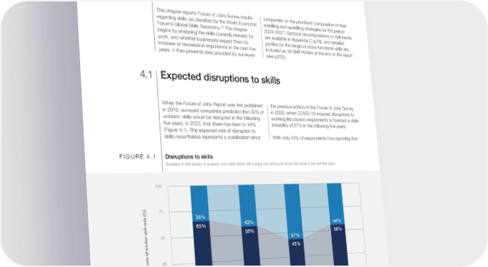 May 2023 Future of Jobs Report 2023 4 Skills outlook This chapter reports Future of Jobs Survey results companies on the prioritized composition of their regarding skills, as classified by the World Economic reskilling and upskilling strategies for the period 53 Forum’s Global Skills Taxonomy. The chapter 2023–2027. Sectoral decompositions of skill trends begins by analysing the skills currently needed for are available in Appendix C (p79), and detailed work, and whether businesses expect them to profiles for the range of cross-functional skills are increase or decrease in importance in the next five included as 26 Skill Profiles at the end of the report years. It then presents data provided by surveyed (see p255). 4.1 Expected disruptions to skills When the Future of Jobs Report was first published the previous edition of the Future of Jobs Survey in 2016, surveyed companies predicted that 35% of in 2020, when COVID-19-induced disruptions to workers’ skills would be disrupted in the following working life caused respondents to forecast a skills five years. In 2023, that share has risen to 44% instability of 57% in the following five years. (Figure 4.1). This expected rate of disruption to skills nevertheless represents a stabilization since With only 43% of respondents now reporting that FIGURE 4.1 Disruptions to skills Evolution in the shares of workers' core skills which will change and which will remain the same in the next five years 100 75 35% 65% 42% 44% 50 58% 56% 57% 43% e of worker skill sets (%) Shar 25 0 2016 2018 2020 2023 Survey year Core skills which will change in the next five years Core skills which will remain the same in the next five years Source Note World Economic Forum, Future of Jobs Surveys Values reported are the mean skill stability percentages estimated by organizations surveyed 2016, 2018, 2020 and 2023. in each edition of the survey. Future of Jobs Report 2023 37