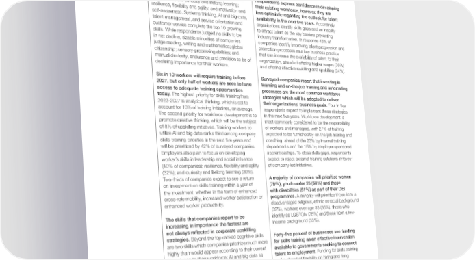Employers estimate that 44% of workers’ skills though AI and big data is part of fewer strategies, will be disrupted in the next five years. Cognitive it tends to be a more important element when it skills are reported to be growing in importance is included. Leadership and social influence ranks most quickly, reflecting the increasing importance five places higher than suggested by its current of complex problem-solving in the workplace. importance and is the highest ranked attitude. Surveyed businesses report creative thinking to Other skills which are strategically emphasized be growing in importance slightly more rapidly by business are design and user experience (nine than analytical thinking. Technology literacy is places higher), environmental stewardship (10 the third-fastest growing core skill. Self-efficacy places higher), marketing and media (six places skills rank above working with others, in the rate higher) and networks and cybersecurity (five places of increase in importance of skills reported by higher). businesses. The socio-emotional attitudes which businesses consider to be growing in importance Respondents express confidence in developing most quickly are curiosity and lifelong learning; their existing workforce, however, they are resilience, flexibility and agility; and motivation and less optimistic regarding the outlook for talent self-awareness. Systems thinking, AI and big data, availability in the next five years. Accordingly, talent management, and service orientation and organizations identify skills gaps and an inability customer service complete the top 10 growing to attract talent as the key barriers preventing skills. While respondents judged no skills to be industry transformation. In response 48% of in net decline, sizable minorities of companies companies identify improving talent progression and judge reading, writing and mathematics; global promotion processes as a key business practice citizenship; sensory-processing abilities; and that can increase the availability of talent to their manual dexterity, endurance and precision to be of organization, ahead of offering higher wages (36%) declining importance for their workers. and offering effective reskilling and upskilling (34%). Six in 10 workers will require training before Surveyed companies report that investing in 2027, but only half of workers are seen to have learning and on-the-job training and automating access to adequate training opportunities processes are the most common workforce today. The highest priority for skills training from strategies which will be adopted to deliver 2023-2027 is analytical thinking, which is set to their organizations’ business goals. Four in five account for 10% of training initiatives, on average. respondents expect to implement these strategies The second priority for workforce development is to in the next five years. Workforce development is promote creative thinking, which will be the subject most commonly considered to be the responsibility of 8% of upskilling initiatives. Training workers to of workers and managers, with 27% of training utilize AI and big data ranks third among company expected to be furnished by on-the-job training and skills-training priorities in the next five years and coaching, ahead of the 23% by internal training will be prioritized by 42% of surveyed companies. departments and the 16% by employer-sponsored Employers also plan to focus on developing apprenticeships. To close skills gaps, respondents worker’s skills in leadership and social influence expect to reject external training solutions in favour (40% of companies); resilience, flexibility and agility of company-led initiatives. (32%); and curiosity and lifelong learning (30%). Two-thirds of companies expect to see a return A majority of companies will prioritize women on investment on skills training within a year of (79%), youth under 25 (68%) and those the investment, whether in the form of enhanced with disabilities (51%) as part of their DEI cross-role mobility, increased worker satisfaction or programmes. A minority will prioritize those from a enhanced worker productivity. disadvantaged religious, ethnic or racial background (39%), workers over age 55 (36%), those who The skills that companies report to be identify as LGBTQI+ (35%) and those from a low- increasing in importance the fastest are income background (33%). not always reflected in corporate upskilling strategies. Beyond the top-ranked cognitive skills Forty-five percent of businesses see funding are two skills which companies prioritize much more for skills training as an effective intervention highly than would appear according to their current available to governments seeking to connect importance to their workforce: AI and big data as talent to employment. Funding for skills training well as leadership and social influence. Companies ranks ahead of flexibility on hiring and firing rank AI and big data 12 places higher in their skills practices (33%), tax and other incentives for strategies than in their evaluation of core skills, and companies to improve wages (33%), improvements report that they will invest an estimated 9% of their to school systems (31%) and changes to reskilling efforts in it – a greater proportion than the immigration laws on foreign talent (28%). more highly-ranked creative thinking, indicating that Future of Jobs Report 2023 7