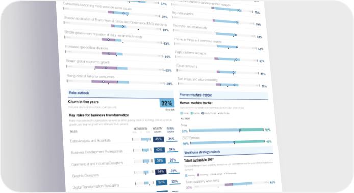 Industry Profile Global Employee (millions, ILO estimates) 1 / 2 Media, Entertainment and Sports 44.8 Trend outlook Global trends and their impact on job creation Technologies and their impact on job creation Trends most most likely to drive industry transformation and their expected impact job creation, ordered by net Technologies most most likely to drive industry transformation and their expected impact job creation, ordered effect (share of organizations surveyed) by net effect (share of organizations surveyed) Job creator Job displacer Net effect Global net effect Job creator Job displacer Net effect Global net effect Broadening digital access Augmented and virtual reality -100% +100% -100% +100% 64% 65% Increased adoption of new and frontier technologies Education and workforce development technologies -100% +100% -100% +100% 57% 65% Consumers becoming more vocal on social issues Big-data analytics -100% +100% -100% +100% 22% 55% Broader application of Environmental, Social and Governance (ESG) standards Encryption and cybersecurity -100% +100% -100% +100% 19% 50% Stricter government regulation of data use and technology Internet of things and connected devices -100% +100% -100% +100% -13% 50% Increased geopolitical divisions Digital platforms and apps -100% +100% -100% +100% -14% 45% Slower global economic growth Cloud computing -100% +100% -100% +100% -22% 35% Rising cost of living for consumers Text, image, and voice processing -100% +100% -100% +100% -29% 35% Role outlook Human-machine frontier Churn in five years Human-machine frontier 32% Five-year structural labour-force churn (percent) Tasks performed by humans and machines today and in 2027 (share of total) Global 23% Human Machine Industry Frontier Global Frontier Key roles for business transformation ALL TASKS Roles most selected by organizations surveyed (as either growing, stable or declining), ordered by net role growth, and their net growth and structural churn (percent) Now NET GROWTH INDUSTRY GLOBAL ROLES -50% 0 50% CHURN CHURN 67% 33% 2027 Forecast 45% 34% Data Analysts and Scientists 58% 43% 40% 24% Business Development Professionals Workforce strategy outlook 34% 26% Commercial and Industrial Designers Talent outlook in 2027 Expected change in talent availability, development and retention in the next five years (share of organizations surveyed) 54% 32% Graphic Designers Improving Worsening Global average Global average 37% 32% Digital Transformation Specialists Talent availability when hiring -100% +100% 20% 55% Advertising and Public Relations 37% 28% Professionals Talent development of existing workforce -100% +100% 0% 75% 17% 23% Application Developers Talent retention of existing workforce Business Services and Administration 48% 22% -100% +100% Managers 10% 70% 24% 25% Project Managers 9% 17% Authors and Journalists 38% 18% Lawyers 25% 19% Accountants and Auditors