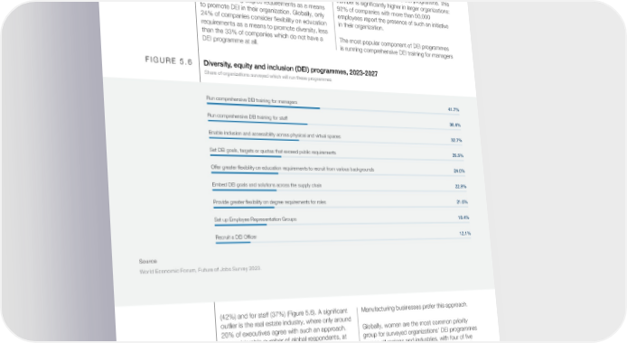Survey responses suggest that university degrees Diversity, equity and inclusion as a hiring criteria remain most recognized among (DEI) companies operating in Bahrain, Saudi Arabia, United Arab Emirates, Egypt, Austria and the Republic of Korea, wherein more than 60% of Under organization transformation and labour- surveyed companies use this as a top criteria market transitions, companies are to play a for skills assessment. By contrast, fewer than more prominent role in supporting fragile and 30% of companies in Romania, Colombia, Latvia disrupted talent groups and advancing social and Sweden use degrees as a top employment justice and DEI. Even though less than one-fifth consideration. of organizations intend to run DEI programmes to boost talent availability, more than two-thirds of the Additionally, and as the following section organizations surveyed have a DEI programme. This demonstrates, comparatively few companies number is significantly higher in larger organizations: consider relaxing degree requirements as a means 92% of companies with more than 50,000 to promote DEI in their organization. Globally, only employees report the presence of such an initiative 24% of companies consider flexibility on education in their organization. requirements as a means to promote diversity, less than the 33% of companies which do not have a The most popular component of DEI programmes DEI programme at all. is running comprehensive DEI training for managers FIGURE 5.6 Diversity, equity and inclusion (DEI) programmes, 2023-2027 Share of organizations surveyed which will run these programmes Run comprehensive DEI training for managers 41.7% Run comprehensive DEI training for staff 36.4% Enable inclusion and accessibility across physical and virtual spaces 32.7% Set DEI goals, targets or quotas that exceed public requirements 25.5% Offer greater flexibility on education requirements to recruit from various backgrounds 24.0% Embed DEI goals and solutions across the supply chain 22.9% Provide greater flexibility on degree requirements for roles 21.6% Set up Employee Representation Groups 18.4% Recruit a DEI Officer 12.1% Source World Economic Forum, Future of Jobs Survey 2023. (42%) and for staff (37%) (Figure 5.6). A significant Manufacturing businesses prefer this approach. outlier is the real estate industry, where only around 20% of executives agree with such an approach. Globally, women are the most common priority A considerable number of global respondents, at group for surveyed organizations’ DEI programmes 33%, prioritize inclusion and accessibility across across all regions and industries, with four of five physical and virtual spaces. Most notably, more respondents identifying them as a priority for DEI than half of respondents in the Insurance and programmes (Figure 5.7). Youth from Gen Z (under Pension Management industry, as well as across 25 years old) are the second-most common priority industries in Australia and Hong Kong SAR, China, group in every region, with an average of two of expect these to be significant components of their three respondents identifying young workers as a DEI programmes. There are, however, divergent priority – these DEI strategies are a constructive opinions on the least adopted DEI measure: way to address the effect on young people’s labour- recruiting a DEI officer. Globally, only 12% of market participation of recent disruptions (see respondents regard this as a priority, while half Chapter 1). Those from a low-income background of the respondents in Egypt are in favour of such are the lowest priorities for all organizations. Less a measure, and more than 30% of Advanced than one-third of the companies surveyed dedicate Future of Jobs Report 2023 55