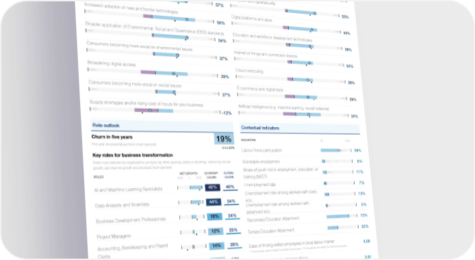 Economy Profile Working Age Population (Millions) 1 / 2 France 46.6 Trend outlook Global trends and their impact on job creation Technologies and their impact on job creation Trends most most likely to drive industry transformation and their expected impact job creation, ordered by net Technologies most most likely to drive industry transformation and their expected impact job creation, ordered effect (share of organizations surveyed) by net effect (share of organizations surveyed) Job creator Job displacer Net effect Global net effect Job creator Job displacer Net effect Global net effect Investments to facilitate the green transition of your business Big-data analytics -100% +100% -100% +100% 60% 57% Climate-change induced investments into adapting operations Encryption and cybersecurity -100% +100% -100% +100% 57% 53% Increased adoption of new and frontier technologies Digital platforms and apps -100% +100% -100% +100% 56% 44% Broader application of Environmental, Social and Governance (ESG) standards Education and workforce development technologies -100% +100% -100% +100% 54% 38% Consumers becoming more vocal on environmental issues Internet of things and connected devices -100% +100% -100% +100% 37% 34% Broadening digital access Cloud computing -100% +100% -100% +100% 29% 28% Consumers becoming more vocal on social issues E-commerce and digital trade -100% +100% -100% +100% 27% 26% Supply shortages and/or rising cost of inputs for your business Artificial intelligence (e.g. machine learning, neural networks) -100% +100% -100% +100% -12% 24% Role outlook Contextual indicators Churn in five years INDICATORS 0% 100% 19% Five-year structural labour-force churn (percent) Global 23% Labour force participation 59% Key roles for business transformation Roles most selected by organizations surveyed (as either growing, stable or declining), ordered by net role Vulnerable employment 8% growth, and their net growth and structural churn (percent) Share of youth not in employment, education, or NET GROWTH ECONOMY GLOBAL 11% ROLES -50% 0 50% CHURN CHURN training (NEET) Unemployment rate 7% 49% 40% AI and Machine Learning Specialists Unemployment rate among workers with basic 12% edu. 44% 34% Data Analysts and Scientists Unemployment rate among workers with 5% advanced edu. 18% 24% Business Development Professionals Secondary Education Attainment 72% 12% 25% Project Managers Tertiary Education Attainment 32% Accounting, Bookkeeping and Payroll 14% 29% Ease of finding skilled employees in local labour market Clerks 4.08 1=Companies cannot easily find skilled employees, 7=Companies can easily find skilled employees 6% 17% Financial Analysts Fill vacancies by hiring foreign labour 3.81 1=Companies cannot fill vacancies by hiring foreign labour, 7=Companies can fill vacancies by hiring foreign labour 19% 17% Assembly and Factory Workers Country investment in mid-career training 4.31 Business Services and Administration 1=Government does not invest in mid-career training, 7=Government invests in mid-career training 19% 22% Managers Workers' Rights Index 2 22% 14% General and Operations Managers 5+=No guarantee of rights due to the breakdown of the rule of law, 1=Sporadic violations of rights Level of National Compliance with Labour Rights 21% 35% Administrative and Executive Secretaries 1 10=The worst possible score, lower levels of compliance, 0=The best possible score, higher levels of compliance 34% 42% Data Entry Clerks