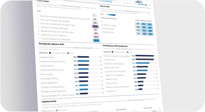 Skill Profile Reskilling Ranking Resilience, flexibility and agility 5th Attitudes Self-efficacy Resilience, flexibility and agility Global Skills Taxonomy / / Five year trend Reskilling focus Skill importance Skill evolution Learning hours spent pursuing assessements and Companies for which Resilience, flexibility and Companies for which Resilience, flexibility and Share of companies for which Resilience, credentials in Resilience, flexibility and agility agility is a priority in their upskilling and reskilling agility is a core skill for workers (share of flexibility and agility is increasing or decreasing from 2017 to 2022 (share of total learning hours). programmes for 2023-2027 (share of companies companies surveyed) in importance at work. White diamond and label Source: Coursera surveyed) represent net share. 1% 32% 50% +66% 0% 2017 2022 Jobs in focus Time to skill Roles where organizations surveyed report Resilience, flexibility and agility to be increasing in importance Learning hours required to achieve a credential in Resilience, flexibility and agility at beginner, intermediate fastest, alongside estimates of the net job growth (percent) from 2023 to 2027. or advanced proficiency as a function of the learner’s level of formal education. Hours 0 34 NET ROLES GROWTH FORMAL EDUCATION BACKGROUND BEGINNER INTERMEDIATE ADVANCED 0% 1. Sales Representatives, Wholesale and Manufacturing, Technical … 3.6 8.8 9.9 All 2% 2. Chemical Processing Plant Operators 3.9 8.8 9.6 No Bachelor's Degree -27% 3. Accounting, Bookkeeping and Payroll Clerks 3.7 9.2 10.5 Bachelor's Degree 0% 4. General and Operations Managers 3.1 9.0 10.1 Graduate Degree -2% 5. Managing Directors and Chief Executives -6% 6. Assembly and Factory Workers 21% 7. Business Development Professionals Strategically adjacent skills Simultaneous skill development Probability that a company which will prioritise skills training in Resilience, flexibility and agility from 2023 to Probability that courses in Resilience, flexibility and agility also teach other skills. Source: Coursera. 2027 will also prioritise other skills. Skill taxonomy Skills, knowledge and abilities Attitudes Skill taxonomy Skills, knowledge and abilities Attitudes 92% Resource management and operations 49% Analytical thinking 92% Creative thinking 48% Leadership and social influence 67% Empathy and active listening 46% Creative thinking 58% Marketing and media 43% Curiosity and lifelong learning 53% Leadership and social influence 41% AI and big data 44% Design and user experience 40% Technological literacy 41% Analytical thinking 37% Talent management 28% Systems thinking 36% Empathy and active listening 25% Reading, writing and mathematics 35% Motivation and self-awareness 19% Programming 33% Service orientation and customer service Industry trends Industry-by-industry variations in reskilling focus, current and future importance, forecast evolution in importance, and strategic focus companies will place on Resilience, flexibility and agility from 2023 to 2027 for the industries which assign the highest and lowest reskilling focus to this skill (share of companies surveyed) Above global mean Below global mean RESKILLING FOCUS SKILL IMPORTANCE SKILL EVOLUTION INDUSTRY 0% 100% 0% 100% 0% 100% Chemical and advanced materials Insurance and pensions management Employment services Accommodation, Food, and Leisure Oil and gas Non-governmental and Membership Organisations