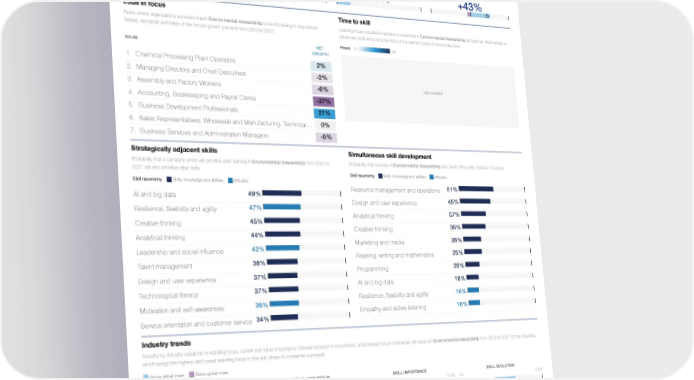 Skill Profile Reskilling Ranking Environmental stewardship 13th Attitudes Ethics Environmental stewardship Global Skills Taxonomy / / Five year trend Reskilling focus Skill importance Skill evolution Learning hours spent pursuing assessements and Companies for which Environmental stewardship Companies for which Environmental stewardship Share of companies for which Environmental credentials in Environmental stewardship from is a priority in their upskilling and reskilling is a core skill for workers (share of companies stewardship is increasing or decreasing in 2017 to 2022 (share of total learning hours). programmes for 2023-2027 (share of companies surveyed) importance at work. White diamond and label Source: Coursera surveyed) represent net share. 1% 21% 16% +43% 0% 2017 2022 Jobs in focus Time to skill Roles where organizations surveyed report Environmental stewardship to be increasing in importance Learning hours required to achieve a credential in Environmental stewardship at beginner, intermediate or fastest, alongside estimates of the net job growth (percent) from 2023 to 2027. advanced proficiency as a function of the learner’s level of formal education. Hours 0 34 NET ROLES GROWTH 2% 1. Chemical Processing Plant Operators -2% 2. Managing Directors and Chief Executives Data unavailable -6% 3. Assembly and Factory Workers -27% 4. Accounting, Bookkeeping and Payroll Clerks 21% 5. Business Development Professionals 0% 6. Sales Representatives, Wholesale and Manufacturing, Technical … -5% 7. Business Services and Administration Managers Strategically adjacent skills Simultaneous skill development Probability that a company which will prioritise skills training in Environmental stewardship from 2023 to Probability that courses in Environmental stewardship also teach other skills. Source: Coursera. 2027 will also prioritise other skills. Skill taxonomy Skills, knowledge and abilities Attitudes Skill taxonomy Skills, knowledge and abilities Attitudes 51% Resource management and operations 49% AI and big data 45% Design and user experience 47% Resilience, flexibility and agility 37% Analytical thinking 45% Creative thinking 35% Creative thinking 44% Analytical thinking 26% Marketing and media 42% Leadership and social influence 25% Reading, writing and mathematics 38% Talent management 20% Programming 37% Design and user experience 18% AI and big data 37% Technological literacy 16% Resilience, flexibility and agility 36% Motivation and self-awareness 16% Empathy and active listening 34% Service orientation and customer service Industry trends Industry-by-industry variations in reskilling focus, current and future importance, forecast evolution in importance, and strategic focus companies will place on Environmental stewardship from 2023 to 2027 for the industries which assign the highest and lowest reskilling focus to this skill (share of companies surveyed) Above global mean Below global mean RESKILLING FOCUS SKILL IMPORTANCE SKILL EVOLUTION INDUSTRY 0% 100% 0% 100% 0% 100% Agriculture, forestry, and fishing Chemical and advanced materials Energy technology and utilities Financial services and capital markets Insurance and pensions management Business support and premises maintenance services