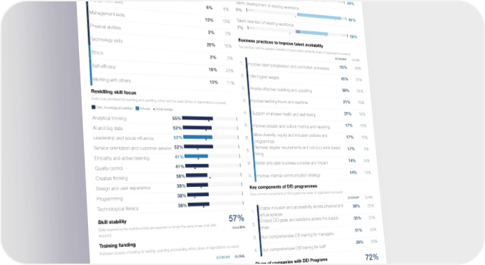 Economy Profile Working Age Population (Millions) / 2 Saudi Arabia NA 6kill outlook :orkIorce strateJ\ outlook Core sRills Talent outlooR in 6kills needed to perform well in key, stable roles within the company (share of organizations surveyed) (xpected change in talent availability, development and retention in the next ıve years (share of organizations surveyed) Skills, knowledge and abilities $ttitudes ,mproving :orsening Global average Global average 2 2 Talent availability when hiring ECONOMY G/2%$/ -100% +100% 21% 59% 26% Cognitive skills Talent development of existing workforce -100% +100% 0% 90% 6% Engagement skills Talent retention of existing workforce 13% Management skills -100% +100% 7% 59% 2% Physical abilities )usiness practices to improve talent availability Top practices with the greatest potential to improve talent availability (share of organizations surveyed) 20% Technology skills ECONOMY G/2%$/ 2% Ethics 55% . Improve talent progression and promotion processes 19% Self-eĴcacy 45% . Oijer higher wages 13 % Working with others 38% . Provide eijective reskilling and upskilling 9esRilling sRill focus 21% . Improve working hours and overtime 6kills most prioritized for reskilling and upskilling in the next ıve years (share of organizations surveyed) Skills, knowledge and abilities $ttitudes Global average 21% . Support employee health and well-being 55% Analytical thinking 17% . Improve people-and-culture metrics and reporting 52% AI and big data More diversity, eTuity and inclusion policies and 17% . 52% Leadership and social inIJuence programmes Remove degree reTuirements and conduct skills-based 52% 17% Service orientation and customer service . hiring 41% Empathy and active listening 14% . Better articulate business purpose and impact 41% 4uality control 14% 38% . Improve internal-communication strategy Creative thinking 38% Design and user experience Key components of +,0 programmes 0ost common components of '(, programmes (share of organizations surveyed) 38% Programming ECONOMY G/2%$/ 38% Technological literacy Enable inclusion and accessibility across physical and 38% . virtual spaces :Rill stability % Embed DEI goals and solutions across the supply 35% 6kills reTuired by the workforce that are expected to remain the same (share of all skills . Global % chain reTuired) 31% . Run comprehensive DEI training for managers Training funding 3referred sources of funding for training, upskilling and reskilling efforts (share of organizations surveyed) 28% . Run comprehensive DEI training for staij ECONOMY GLOBAL :hare of companies ^ith +,0 7rograms 14% 16% Co-funding across the industry 2% (share of organizations surveyed) Global % 31% 28% Free-of-cost training 45% 22% Funded by government 79% 87% Funded by my organization 31% 24% Public-private hybrid funding