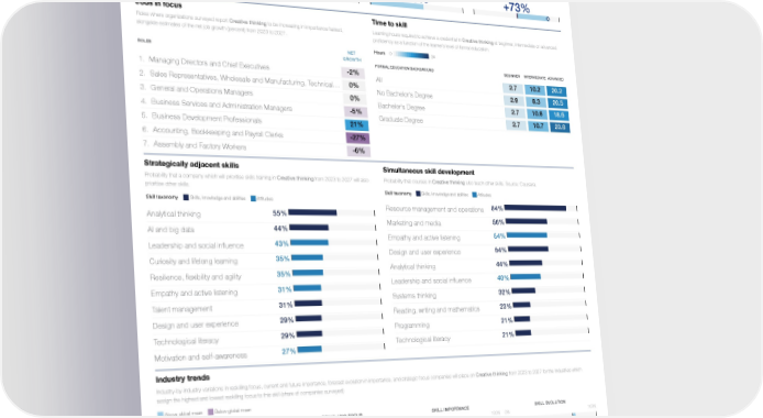 Skill Profile Reskilling Ranking Creative thinking 2nd Skills, knowledge and abilities Cognitive skills Creative thinking Global Skills Taxonomy / / Five year trend Reskilling focus Skill importance Skill evolution Learning hours spent pursuing assessements and Companies for which Creative thinking is a priority Companies for which Creative thinking is a core Share of companies for which Creative thinking is credentials in Creative thinking from 2017 to 2022 in their upskilling and reskilling programmes for skill for workers (share of companies surveyed) increasing or decreasing in importance at work. (share of total learning hours). Source: Coursera 2023-2027 (share of companies surveyed) White diamond and label represent net share. 4% 42% 56% +73% 0% 2017 2022 Jobs in focus Time to skill Roles where organizations surveyed report Creative thinking to be increasing in importance fastest, Learning hours required to achieve a credential in Creative thinking at beginner, intermediate or advanced alongside estimates of the net job growth (percent) from 2023 to 2027. proficiency as a function of the learner’s level of formal education. Hours 0 34 NET ROLES GROWTH FORMAL EDUCATION BACKGROUND BEGINNER INTERMEDIATE ADVANCED -2% 1. Managing Directors and Chief Executives 2.7 10.2 20.2 All 0% 2. Sales Representatives, Wholesale and Manufacturing, Technical … 2.9 8.3 20.5 No Bachelor's Degree 0% 3. General and Operations Managers 2.7 10.6 18.6 Bachelor's Degree -5% 4. Business Services and Administration Managers 2.7 10.7 23.6 Graduate Degree 21% 5. Business Development Professionals -27% 6. Accounting, Bookkeeping and Payroll Clerks -6% 7. Assembly and Factory Workers Strategically adjacent skills Simultaneous skill development Probability that a company which will prioritise skills training in Creative thinking from 2023 to 2027 will also Probability that courses in Creative thinking also teach other skills. Source: Coursera. prioritise other skills. Skill taxonomy Skills, knowledge and abilities Attitudes Skill taxonomy Skills, knowledge and abilities Attitudes 84% Resource management and operations 55% Analytical thinking 56% Marketing and media 44% AI and big data 54% Empathy and active listening 43% Leadership and social influence 54% Design and user experience 35% Curiosity and lifelong learning 44% Analytical thinking 35% Resilience, flexibility and agility 40% Leadership and social influence 31% Empathy and active listening 32% Systems thinking 31% Talent management 23% Reading, writing and mathematics 29% Design and user experience 21% Programming 29% Technological literacy 21% Technological literacy 27% Motivation and self-awareness Industry trends Industry-by-industry variations in reskilling focus, current and future importance, forecast evolution in importance, and strategic focus companies will place on Creative thinking from 2023 to 2027 for the industries which assign the highest and lowest reskilling focus to this skill (share of companies surveyed) Above global mean Below global mean RESKILLING FOCUS SKILL IMPORTANCE SKILL EVOLUTION INDUSTRY 0% 100% 0% 100% 0% 100% Medical and healthcare services Care, Personal Services and Wellbeing Real estate Retail and wholesale of consumer goods Mining and Metals Insurance and pensions management