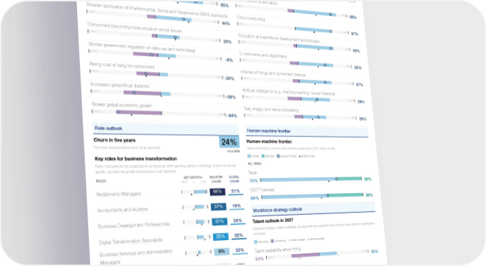 Industry Profile Global Employee (millions, ILO estimates) 1 / 2 Employment services 7.9 Trend outlook Global trends and their impact on job creation Technologies and their impact on job creation Trends most most likely to drive industry transformation and their expected impact job creation, ordered by net Technologies most most likely to drive industry transformation and their expected impact job creation, ordered effect (share of organizations surveyed) by net effect (share of organizations surveyed) Job creator Job displacer Net effect Global net effect Job creator Job displacer Net effect Global net effect Broadening digital access Big-data analytics -100% +100% -100% +100% 71% 81% Increased adoption of new and frontier technologies Digital platforms and apps -100% +100% -100% +100% 65% 68% Broader application of Environmental, Social and Governance (ESG) standards Cloud computing -100% +100% -100% +100% 44% 67% Consumers becoming more vocal on social issues Education and workforce development technologies -100% +100% -100% +100% 29% 63% Stricter government regulation of data use and technology E-commerce and digital trade -100% +100% -100% +100% -9% 50% Rising cost of living for consumers Internet of things and connected devices -100% +100% -100% +100% -20% 47% Increased geopolitical divisions Artificial intelligence (e.g. machine learning, neural networks) -100% +100% -100% +100% -38% 29% Slower global economic growth Text, image, and voice processing -100% +100% -100% +100% -64% 29% Role outlook Human-machine frontier Churn in five years Human-machine frontier 24% Five-year structural labour-force churn (percent) Tasks performed by humans and machines today and in 2027 (share of total) Global 23% Human Machine Industry Frontier Global Frontier Key roles for business transformation ALL TASKS Roles most selected by organizations surveyed (as either growing, stable or declining), ordered by net role growth, and their net growth and structural churn (percent) Now NET GROWTH INDUSTRY GLOBAL ROLES -50% 0 50% CHURN CHURN 74% 26% 2027 Forecast 55% 31% Relationship Managers 64% 36% 37% 19% Accountants and Auditors Workforce strategy outlook 31% 24% Business Development Professionals Talent outlook in 2027 Expected change in talent availability, development and retention in the next five years (share of organizations surveyed) 25% 32% Digital Transformation Specialists Improving Worsening Global average Global average Business Services and Administration 9% 22% Talent availability when hiring Managers -100% +100% 53% 35% 1% 19% Recruiters and technical recruiters Talent development of existing workforce -100% +100% 12% 82% 29% 21% Sales and Marketing Professionals Talent retention of existing workforce 10% 19% Software and Applications Developers -100% +100% 18% 59% Client Information and Customer Service 27% 20% Workers 24% 35% Administrative and Executive Secretaries 52% 42% Data Entry Clerks Accounting, Bookkeeping and Payroll 46% 29% Clerks