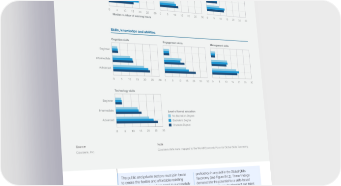FIGURE B4.2 Formal education does not affect the time taken to acquire online skill credentials Median number of learning hours taken by users to successfully complete credentials on the Coursera online learning platform, as a function of the skill proficiency taught by the course and the learner's level of formal education Attitudes Ethics Self-efficacy Working with others Beginner oficiencyIntermediate Skill pr Advanced 00 55 1010 1515 2020 2525 3030 0 5 10 15 20 25 30 0 5 10 15 20 25 30 Median number of learning hours Skills, knowledge and abilities Cognitive skills Engagement skills Management skills Beginner Intermediate Advanced 00 55 1010 1515 2020 2525 3030 0 5 10 15 20 25 30 0 5 10 15 20 25 30 Technology skills Beginner Intermediate Level of formal education No Bachelor’s Degree Advanced Bachelor’s Degree Graduate Degree 00 55 1010 1515 2020 2525 3030 Source Note Coursera, Inc. Coursera data were mapped to the World Economic Forum's Global Skills Taxonomy. The public and private sectors must join forces proficiency in any skill in the Global Skills to create the flexible and affordable reskilling Taxonomy (see Figure B4.2). These findings pathways displaced workers need to successfully demonstrate the potential for a skills-based transition at scale into the jobs of the future (see approach to workforce development and talent Chapter 3). With a skills-based talent approach, management to close skills gaps and address employers can diversify and expand their hiring labour shortages, especially in light of the pipelines for incoming talent while also creating disproportionate impact of recent disruptions on pathways for employee reskilling necessary to the labour-market participation of workers with adapt to fast-changing workforce requirements basic education (see Chapter 1). and encourage lifelong learning at work. Encouragingly, Coursera data show no evidence that learners without a degree take longer to achieve beginner, intermediate or advanced Future of Jobs Report 2023 45